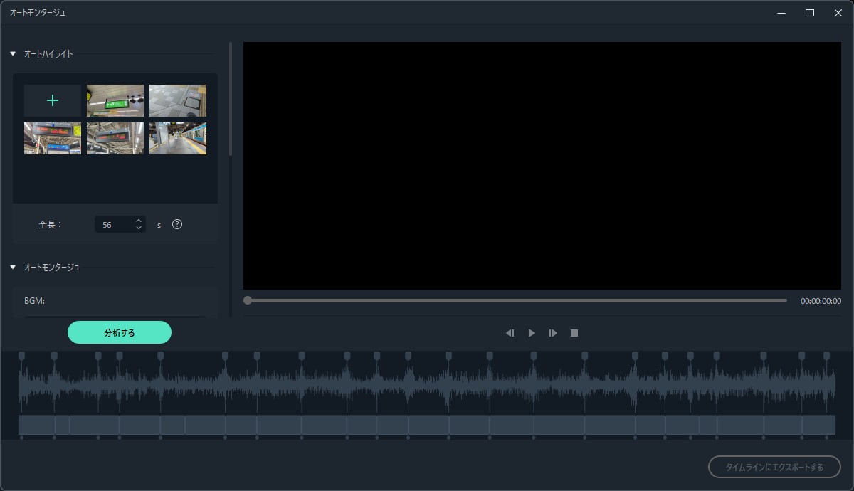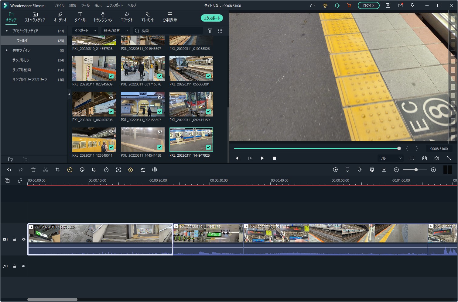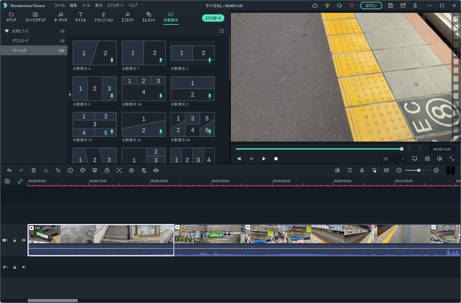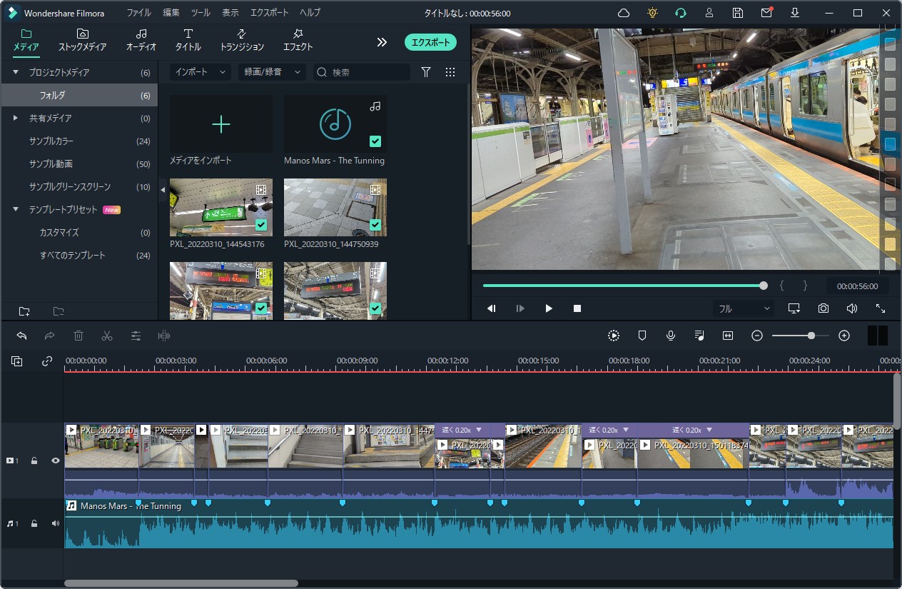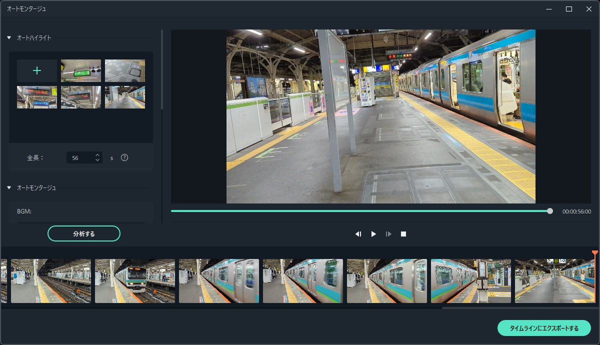「タイムラインにエクスポートする」とすると、メインの編集画面にインポートされました。ある程度は自動で行いつつ、細かい部分は手動で行っていくというのがオートモンタージュ機能なようですね。