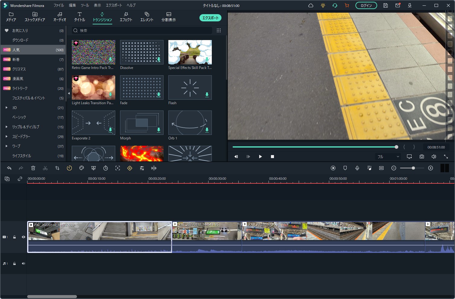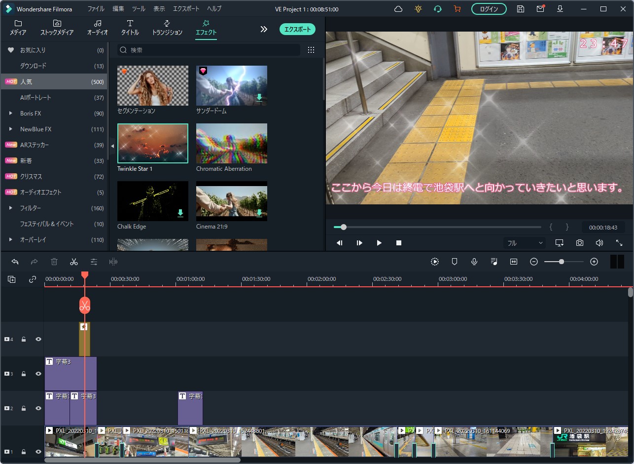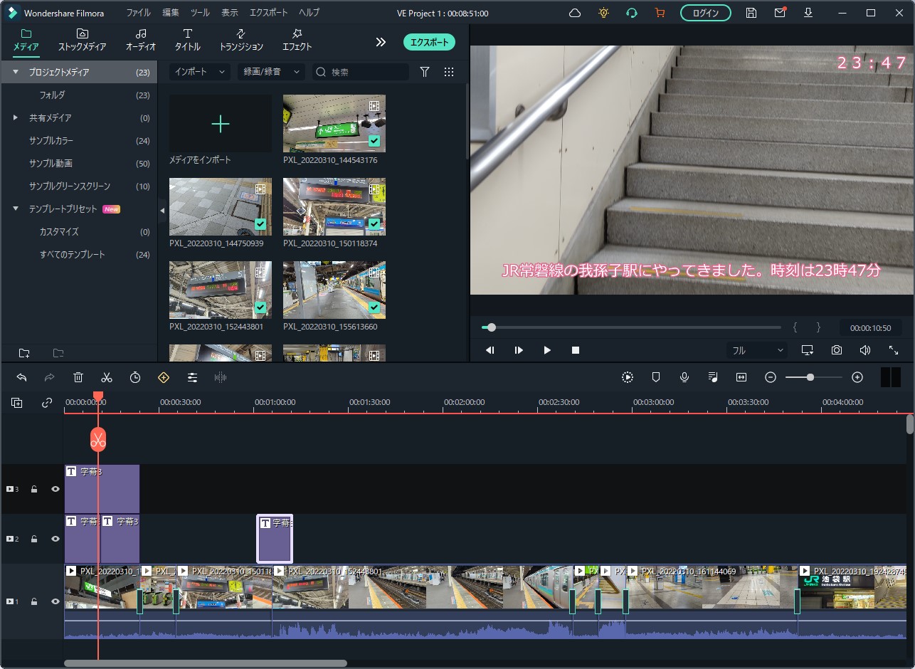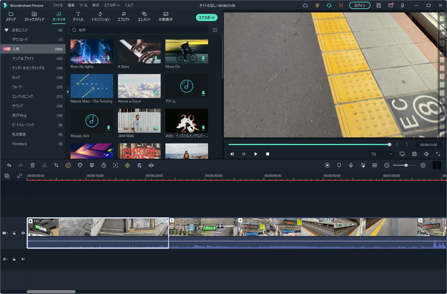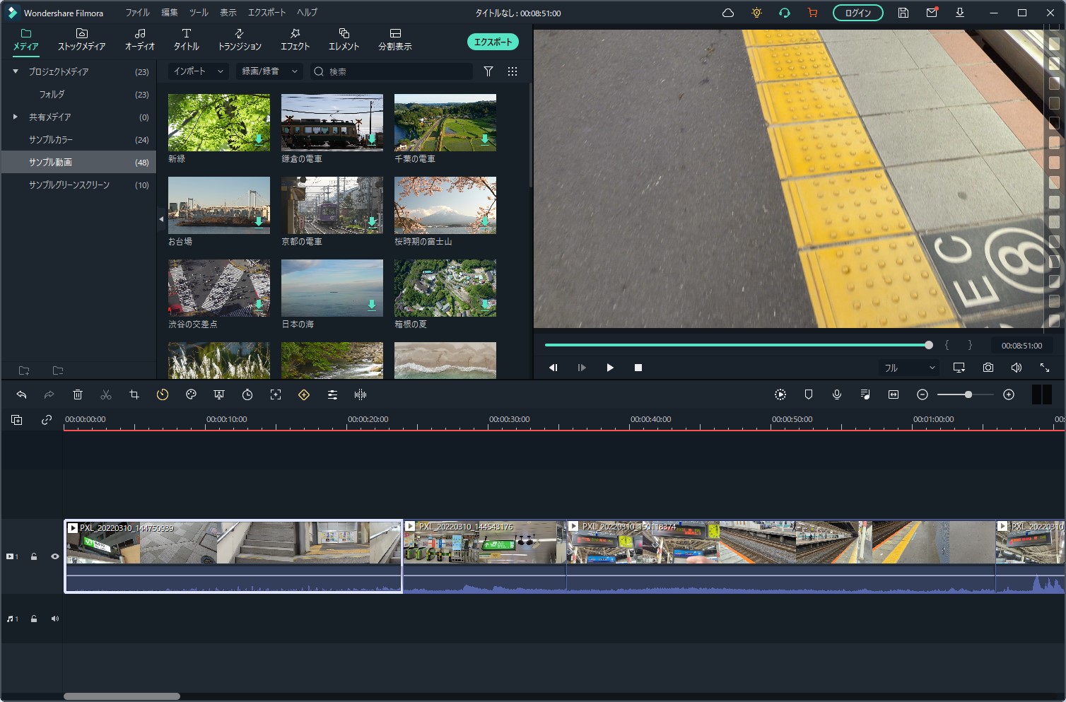 「タイムラインにエクスポートする」とすると、メインの編集画面にインポートされました。ある程度は自動で行いつつ、細かい部分は手動で行っていくというのがオートモンタージュ機能なようですね。