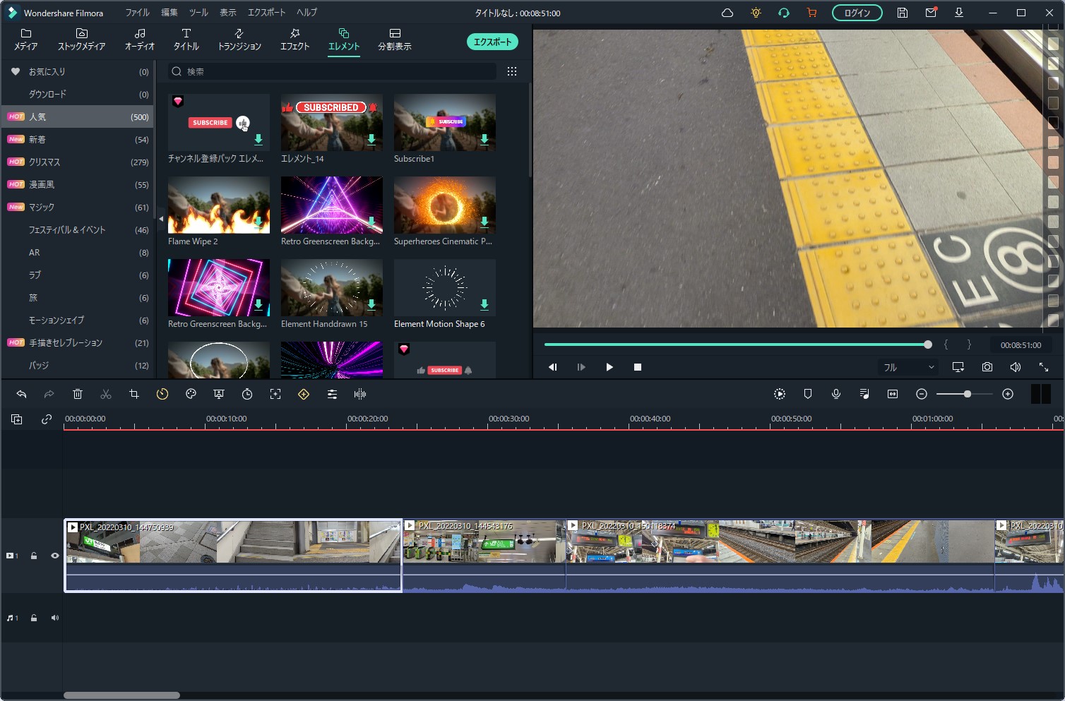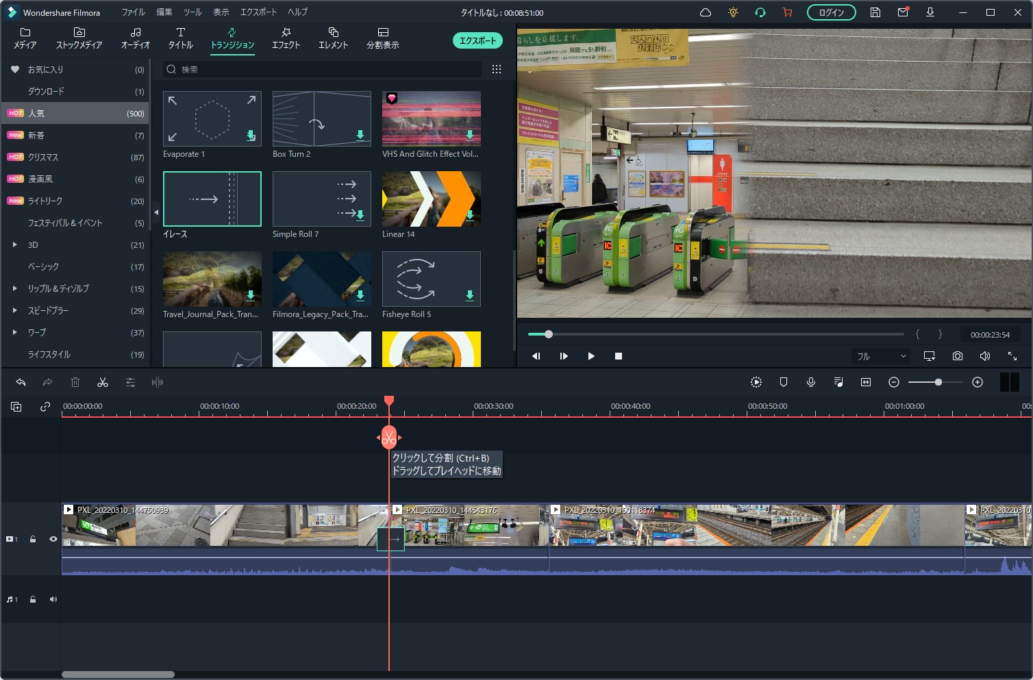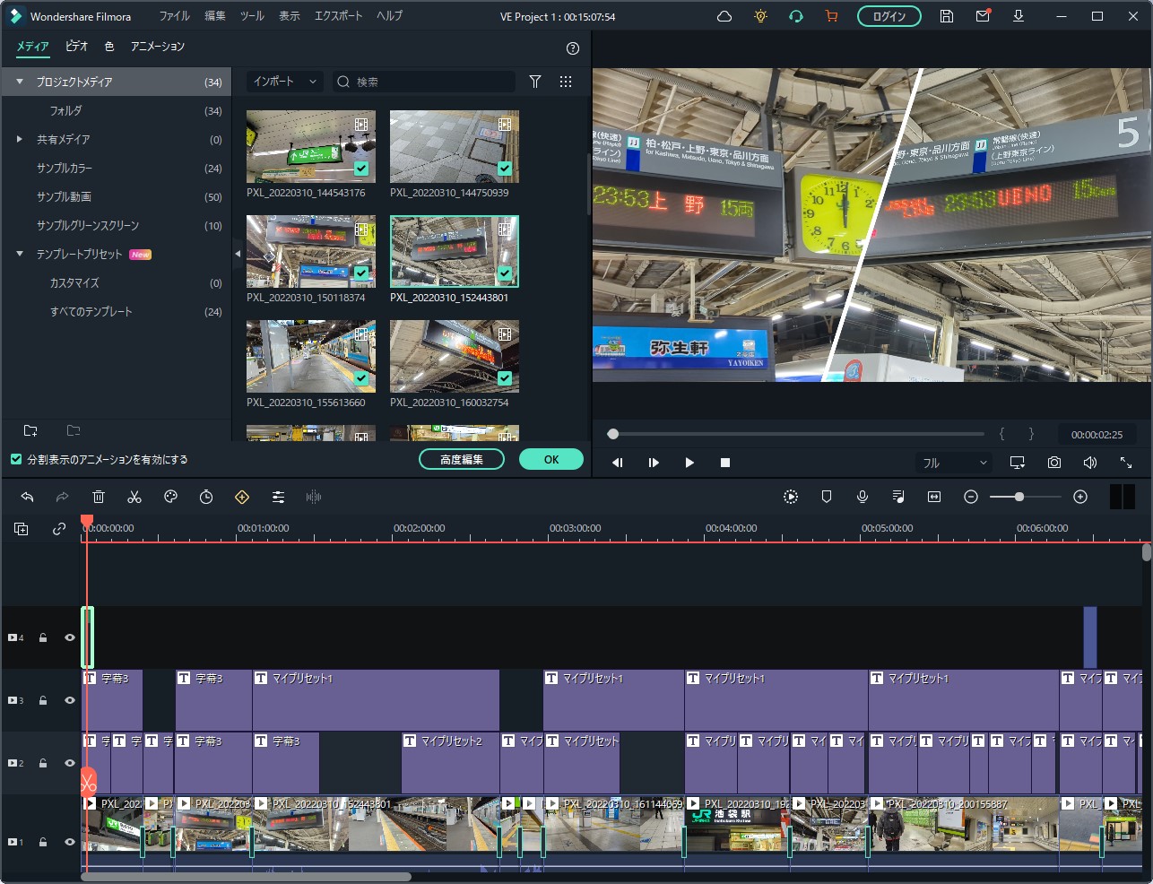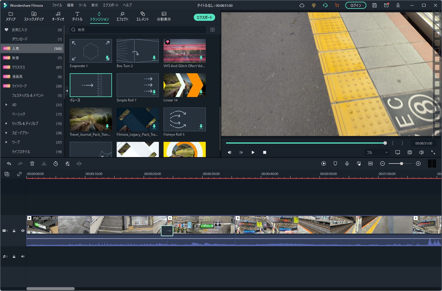 「タイムラインにエクスポートする」とすると、メインの編集画面にインポートされました。ある程度は自動で行いつつ、細かい部分は手動で行っていくというのがオートモンタージュ機能なようですね。