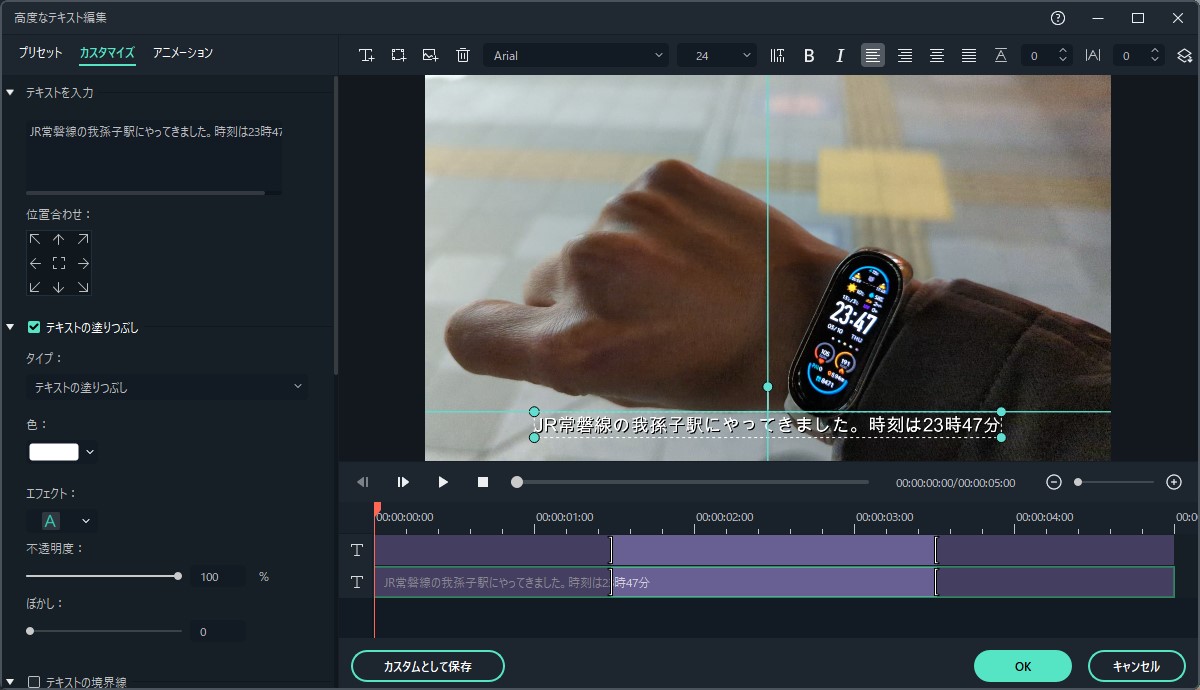 また、レイヤーを重ねることによって同じ場面に複数の字幕を付けることも可能です。今回は右上に追加で時刻の表示を追加してみました。