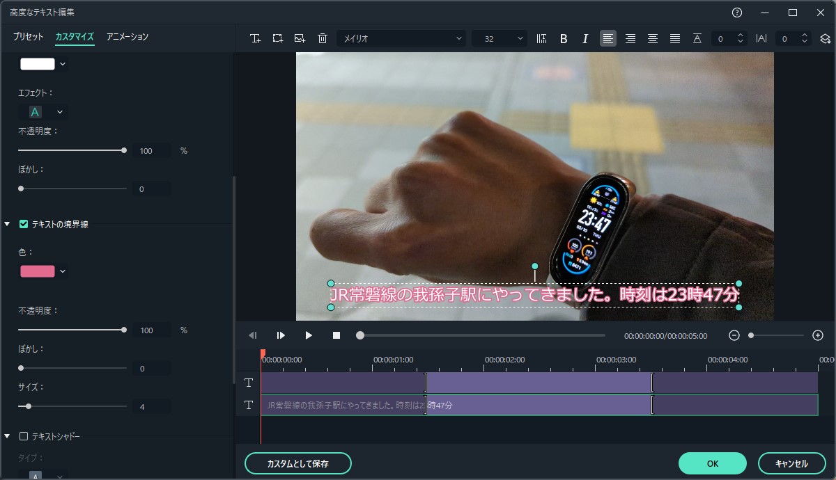 「高度編集」ボタンをクリックすると、詳細設定が可能です。位置の変更は良くありますが、中心に合わせる機能が付いているのは嬉しいですね、しかしなんか見にくいので、色味やフォントを調整してみましょう。