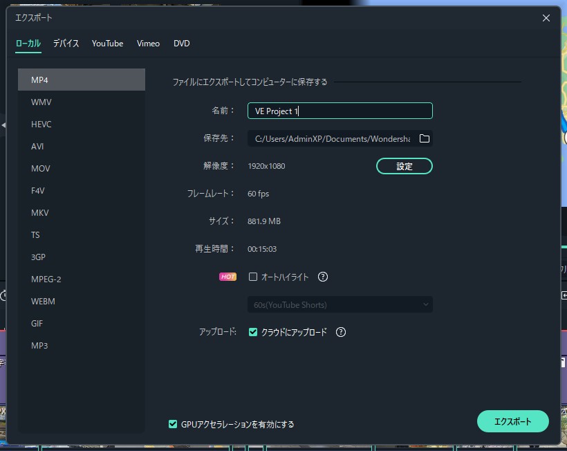エクスポート画面は至ってシンプル。基本的にはMP4がベースとなりますが、他の形式へのエンコードを兼ねた出力も可能となっています。