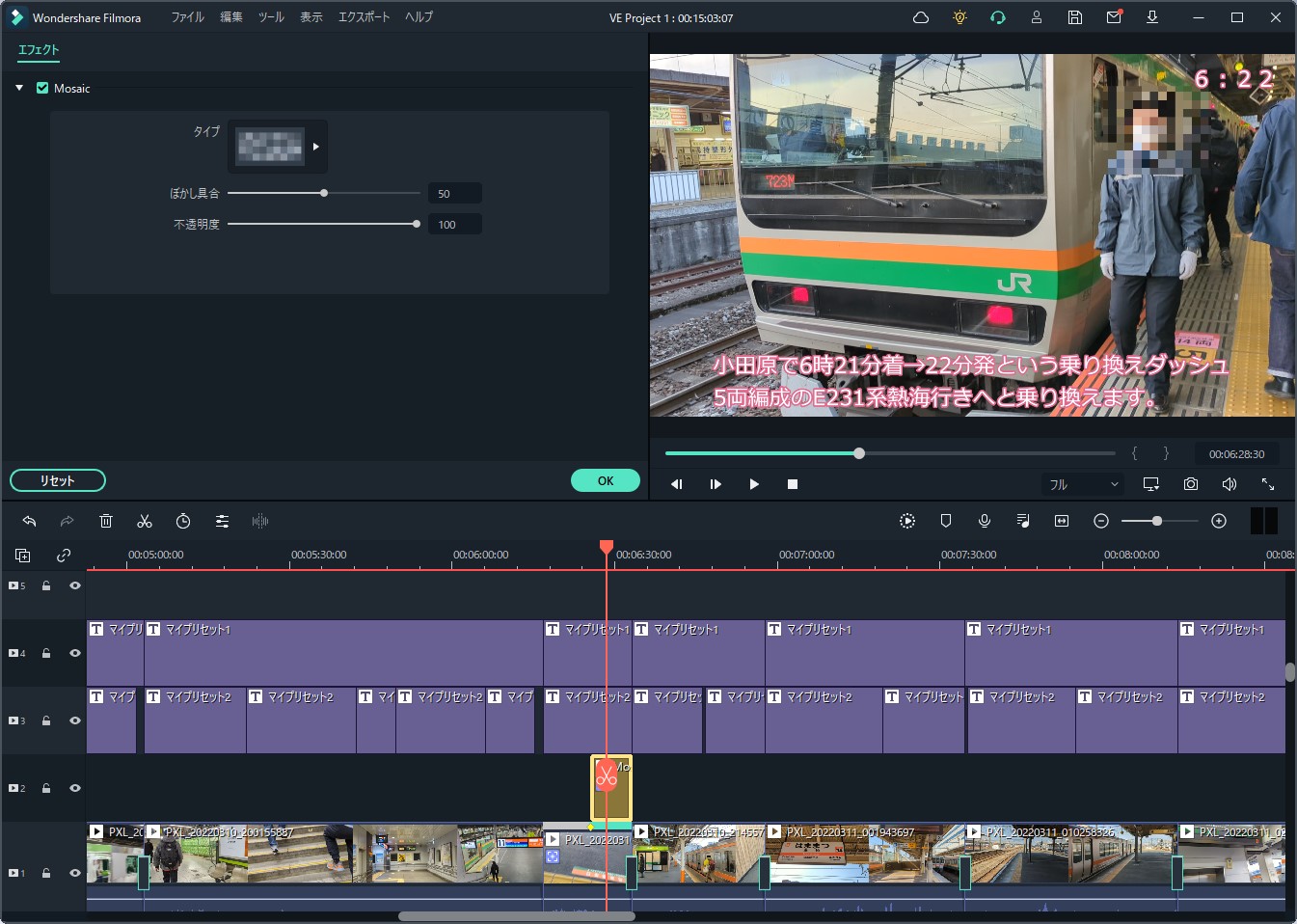 実際にモザイクを掛けてみるとこんな感じ。動くものとそうじゃないものはそれぞれ使い分けると便利だと思います。しかしこのモーショントラッキング機能ですが、1キャプチャーごとに全て検知するようで、もう対象物がフレームアウトしてるから止めたいというのが出来ないのが不便だなと思いました。あとからモザイクしたい部分以外をカットするなどの細かい調整が必要です。