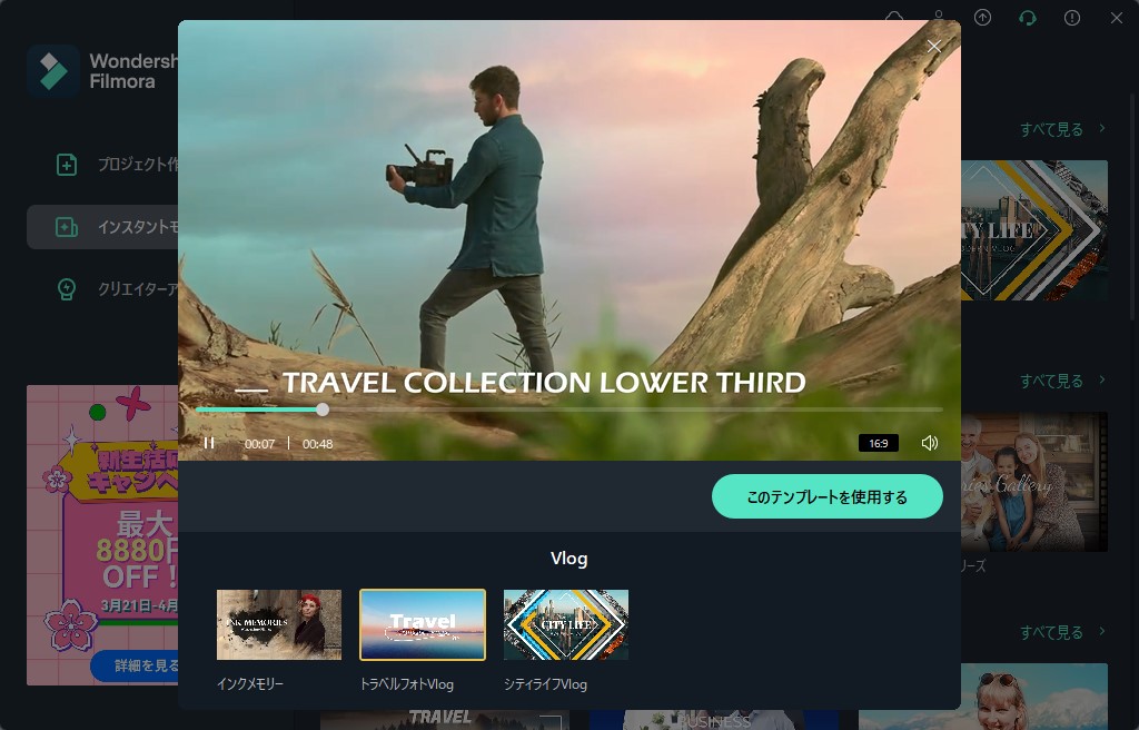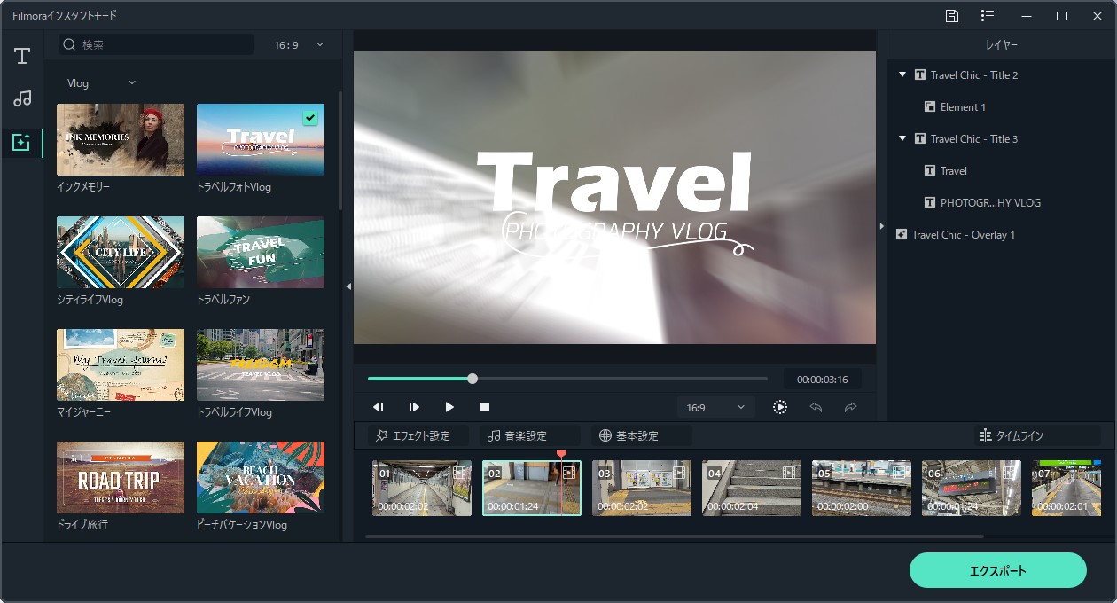 このインスタントモードというのは、予め用意されたテンプレートを使ってほぼ自動で動画を作ってくれる機能です。今回は元ネタが旅行動画なので、「トラベルフォトVlog」を使ってみました。