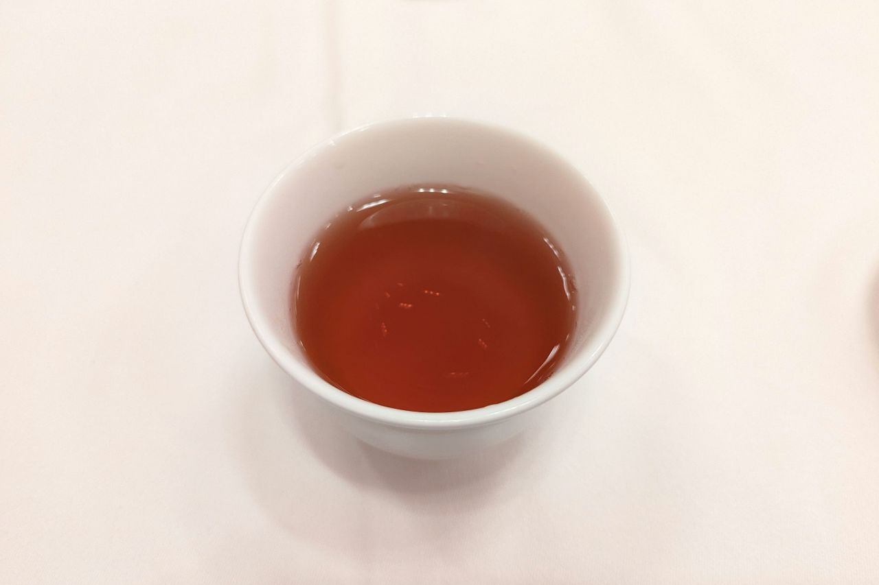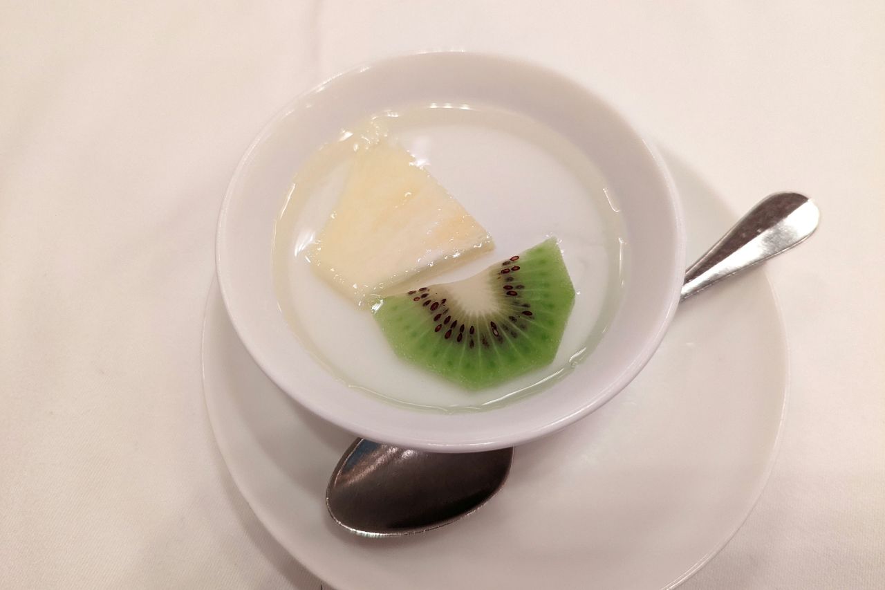 そしてデザート。杏仁豆腐が出てきました。寒天とまではいきませんが、ツルツルした食感の杏仁豆腐です。