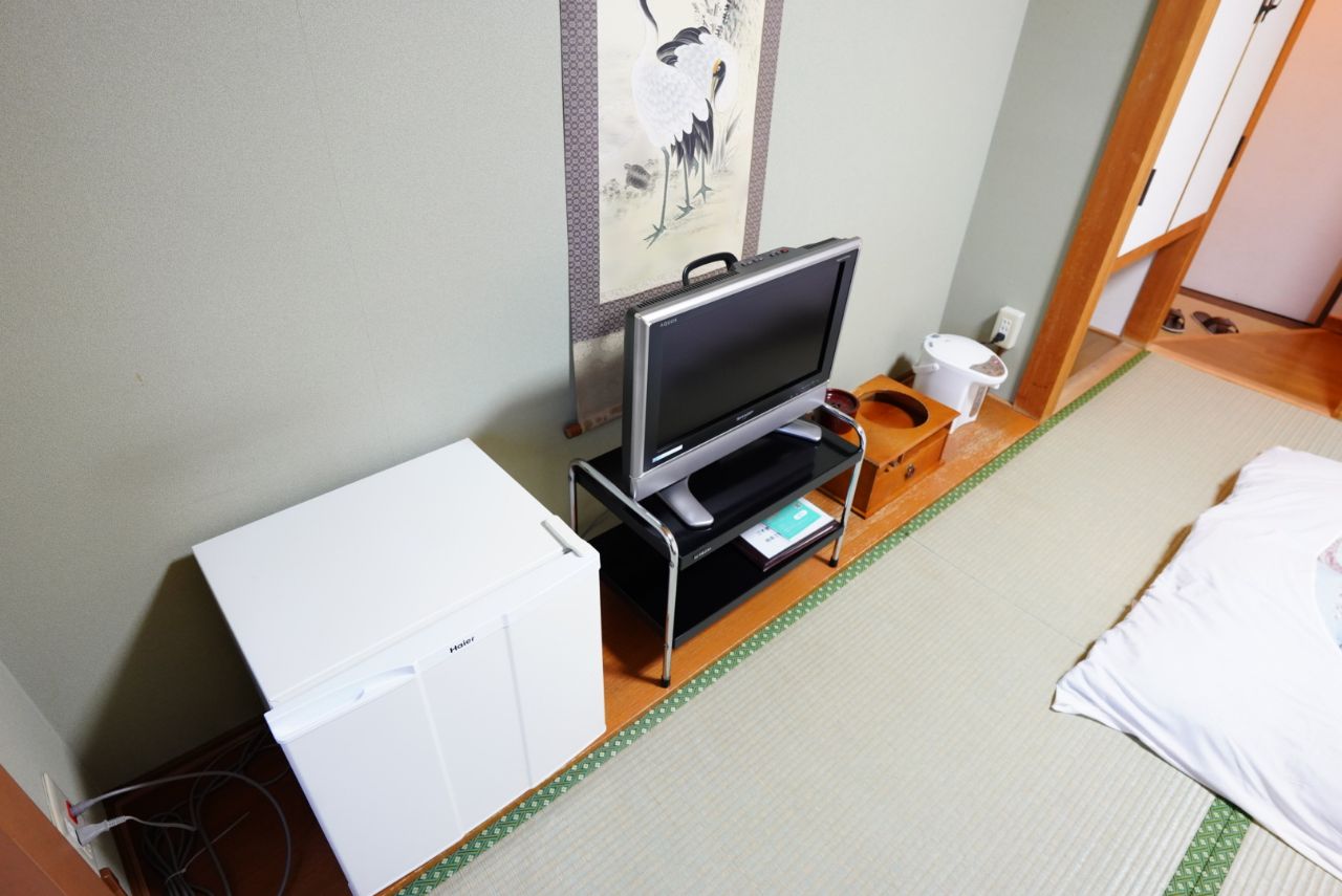 入口は洋風ですが、部屋は和室。バストイレ別となっていますが、冷蔵庫などは用意されています。