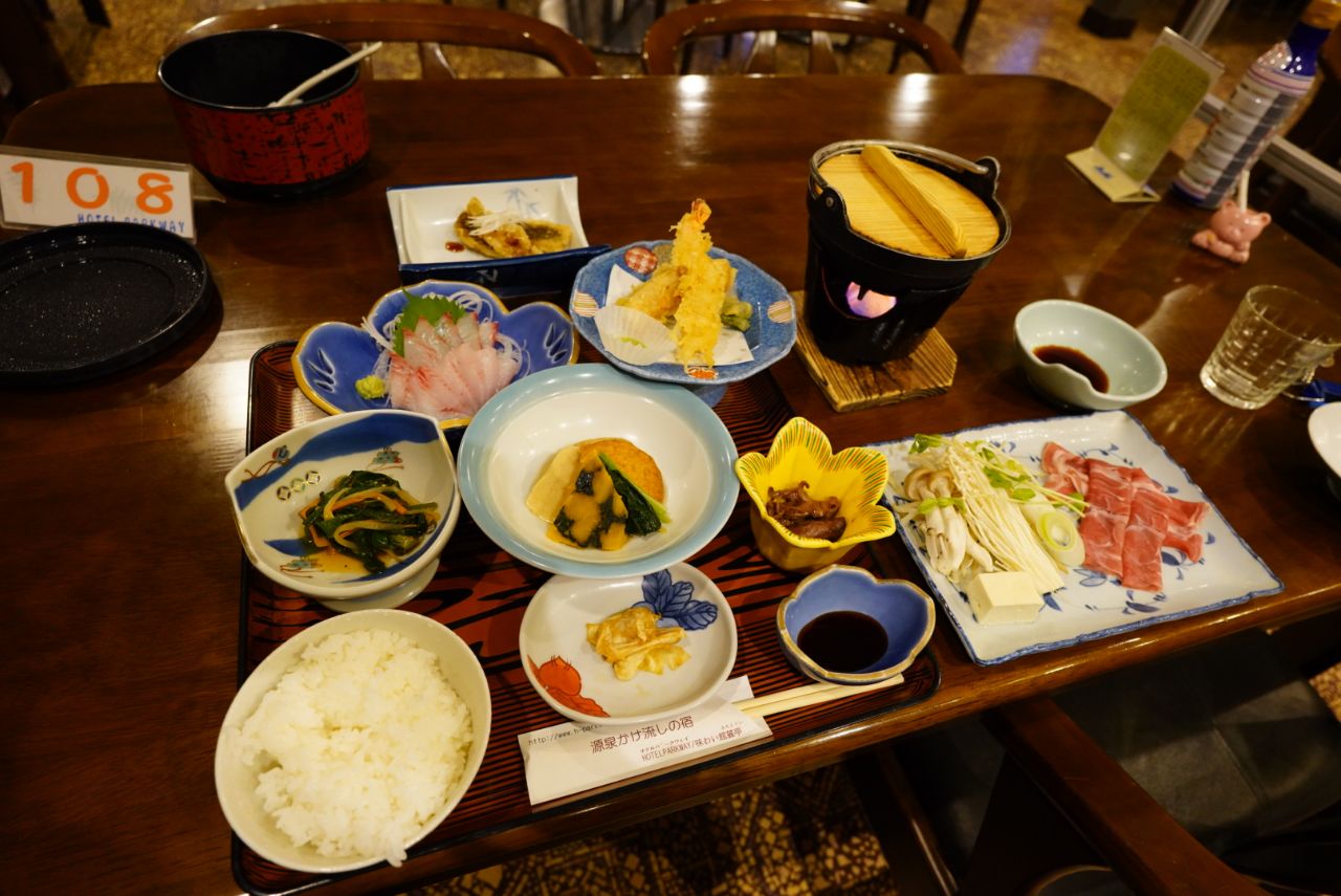 こちらが夕食。摩周鯛の刺身に唐揚げの他、ラムしゃぶや天ぷらなど種類豊富なメニューが並びます。この食事が付いて7,150円(別途入湯税150円)だから安い。