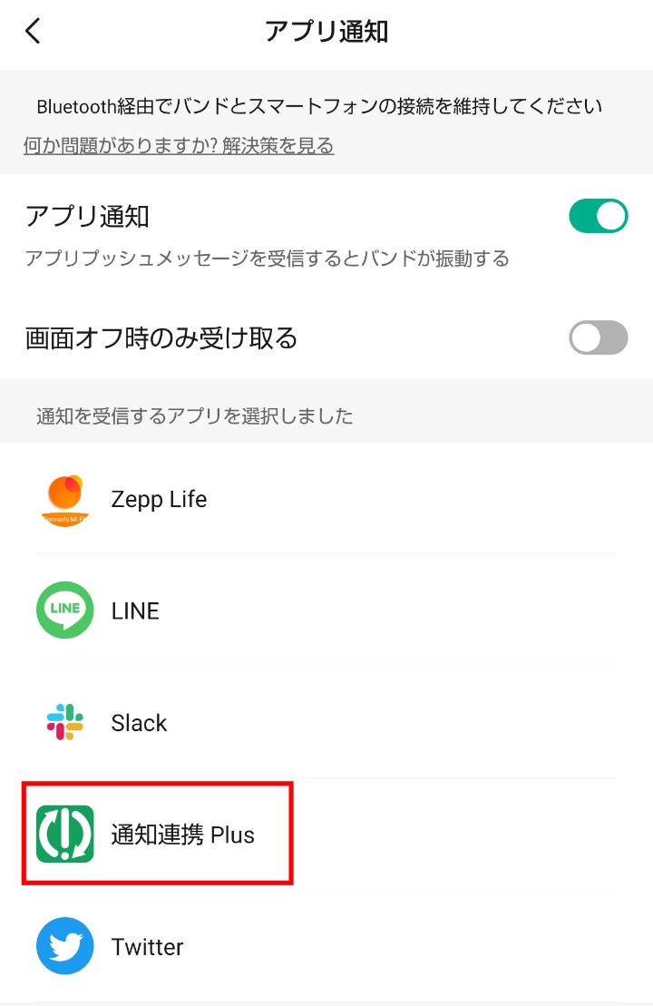 あとはスマートバンド側で「通知連携 Plus」を通知を受けるアプリとして指定すれば完成。無事に他のスマホの通知がスマートバンドで受けられるようになりました。