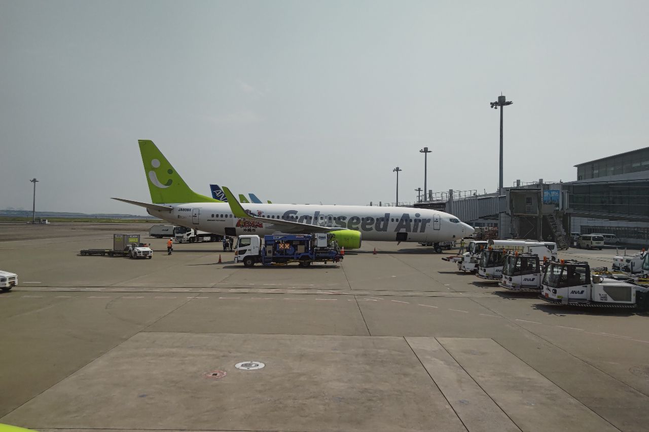 機体は緑をベースにしてソラシドエアと側面に書かれた機体です。今回乗ったのはボーイング737-800で中型の良くみられる機体ですね。