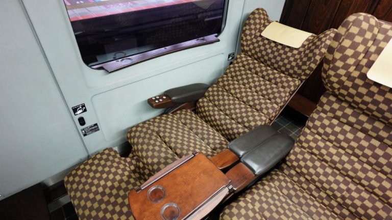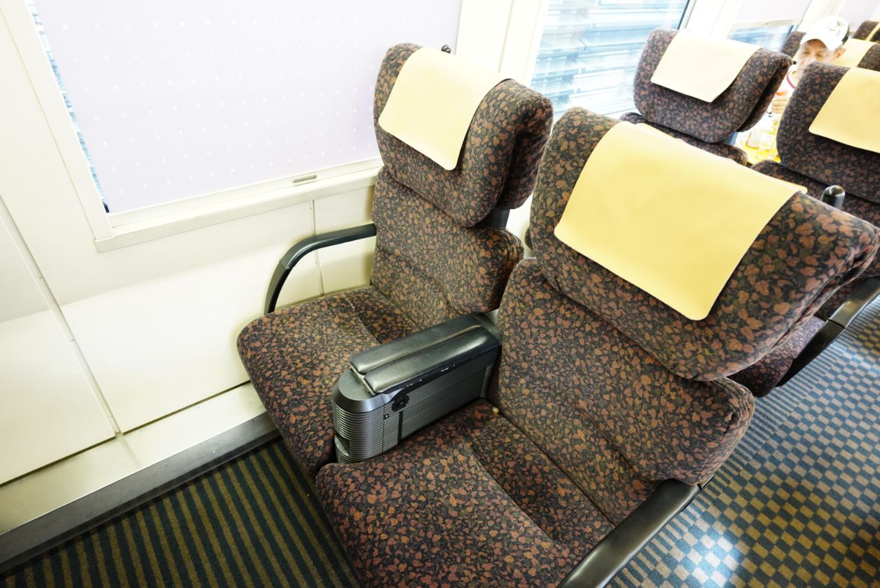 元々食堂車だった車両が4号車なのですが、そのせいで荷物棚が無い変わりにシートピッチが広々としています。どうせ乗るなら4号車がおすすめ。