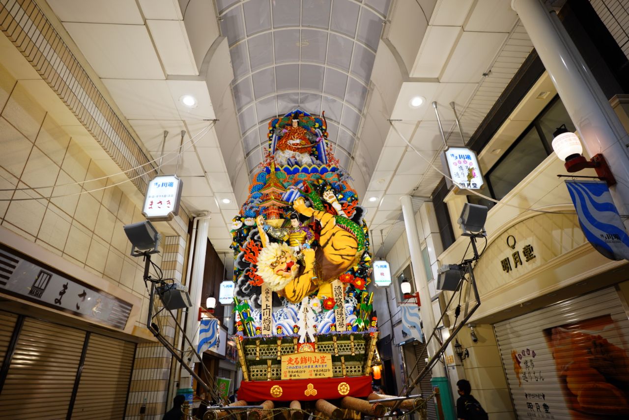 中洲川端の商店街を進むと山笠が展示されていました。博多祇園山笠の祭りの一環で展示されているみたいですね。