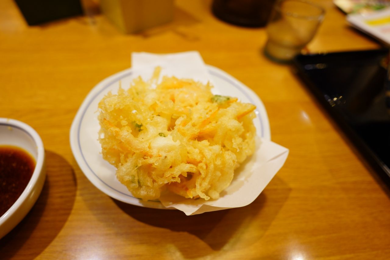 そしてもうひとつ頼んだのがこのかき揚げ。200円しないんですがとても大きくて食べ応え十分なかき揚げです。うどんのだし残しておけばよかったな……。