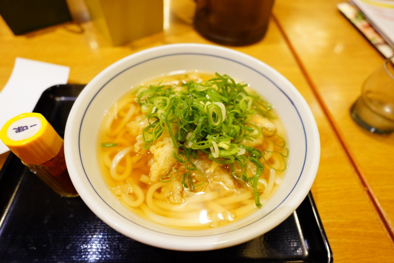 注文したのはごぼう天うどん。やわいうどんに揚げたてのごぼう天が乗ったうどんです。博多に来たらやはりこれを食べないと。