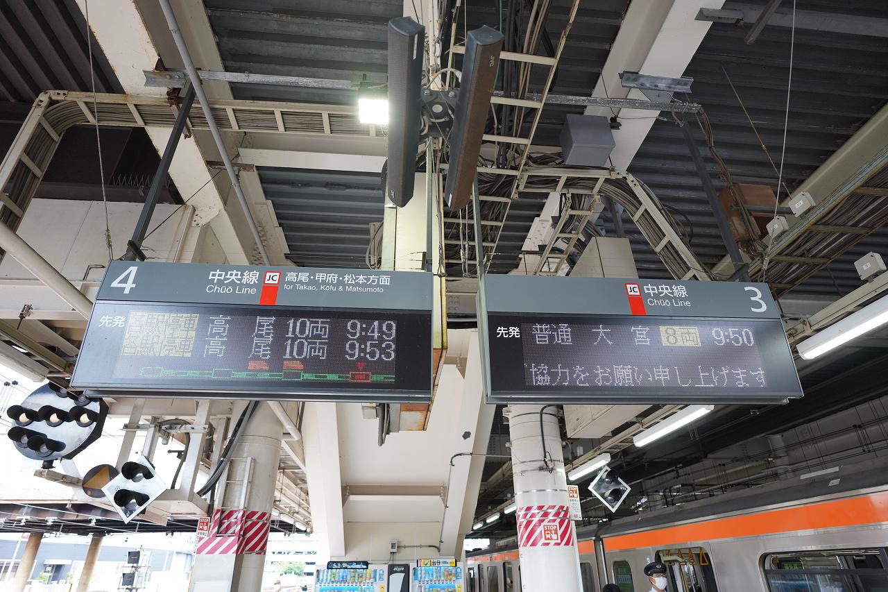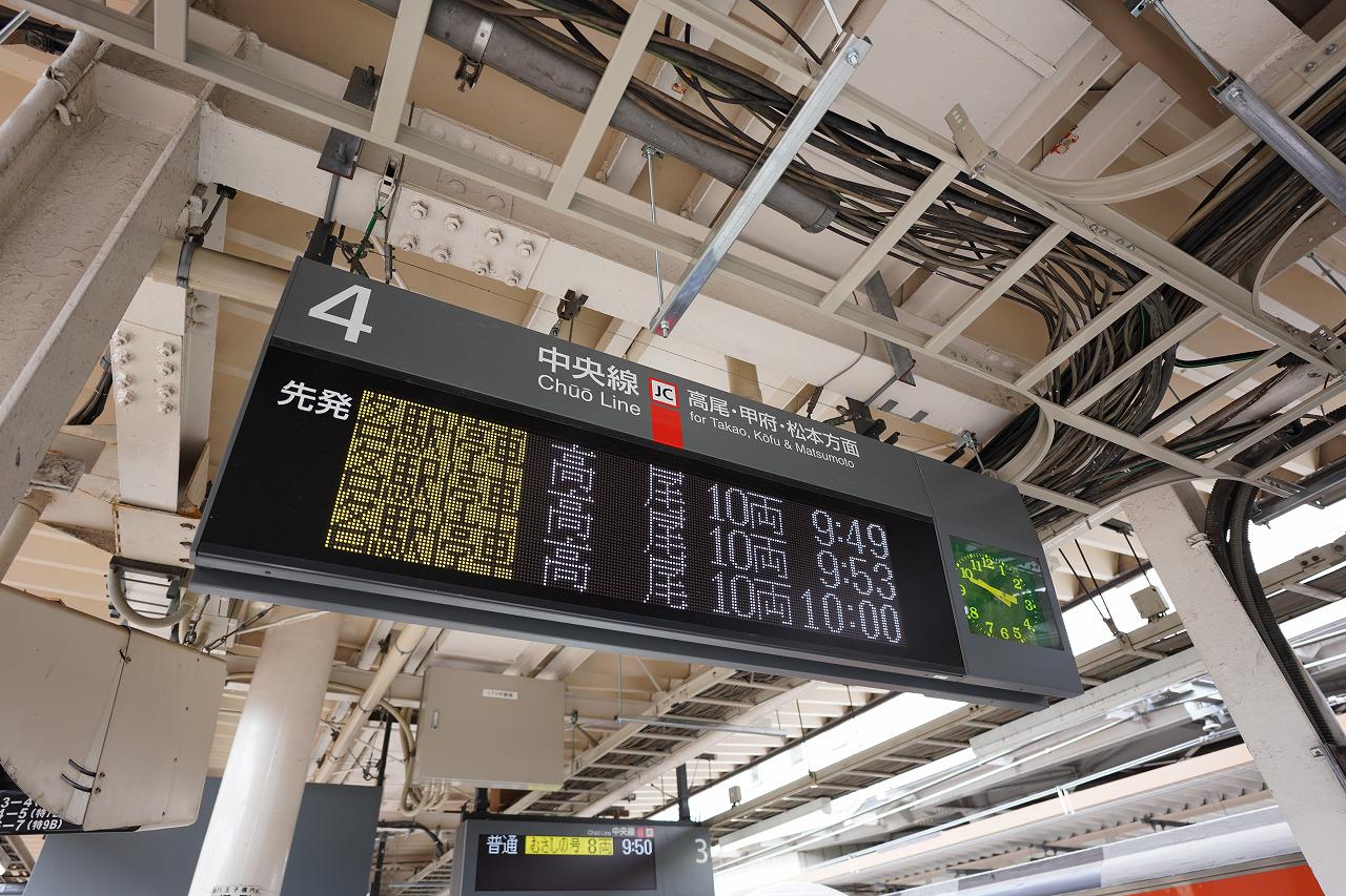 高尾駅に到着。この先は長距離列車に乗り換えていきます。行き先は「松本」です。長野県まで永遠と各駅に停車し続ける列車です。しかし上には上が居て、高尾発長野行きという列車も……。