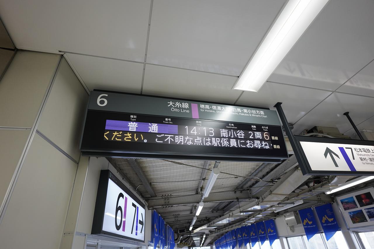 それでは中央線から大糸線のホームへと向かいます。一部の直通列車を除き、大糸線の列車はちょっと離れたホームから乗車します。アルピコ交通(松本電鉄)上高地線と同じホームとなっています。