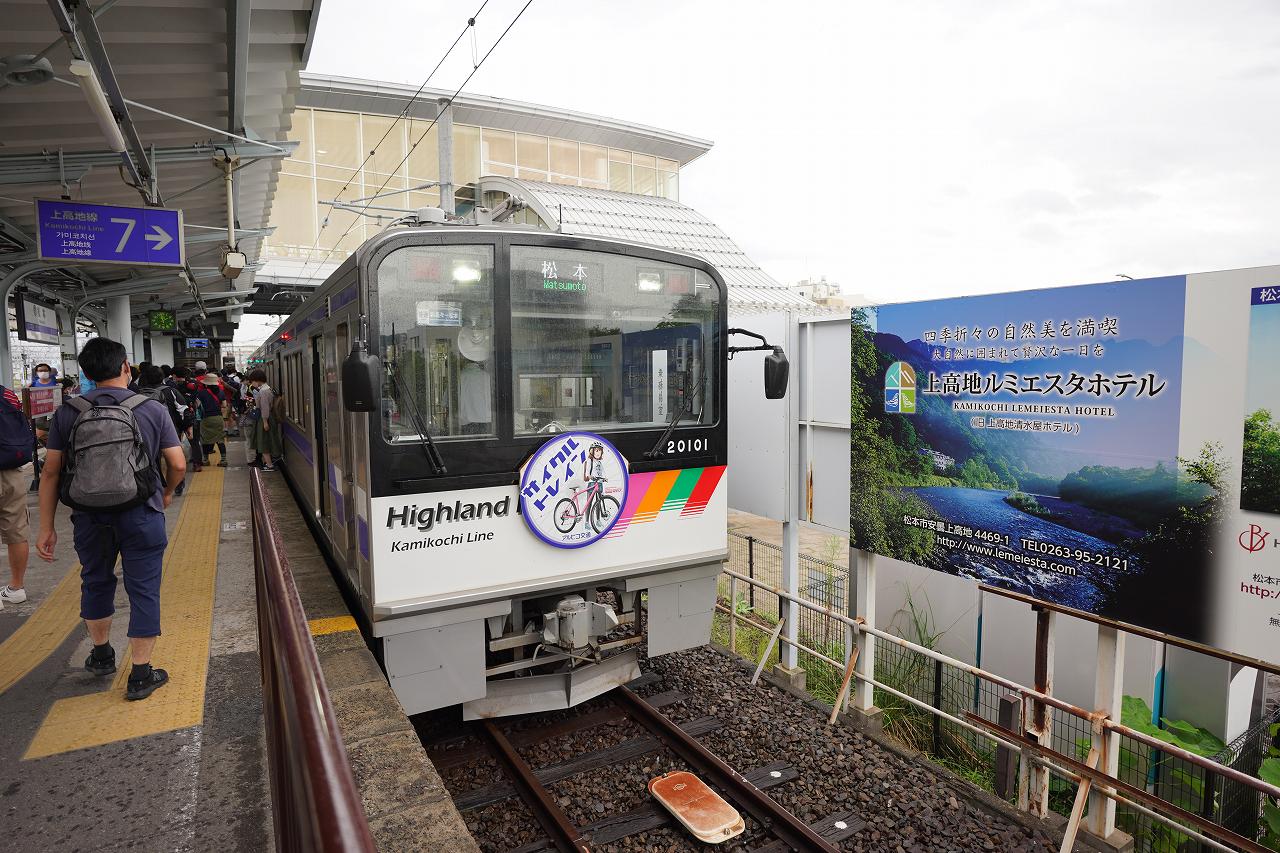 上高地線といえば、以前東武20000型が譲渡されたという話がありましたよね。ちょうど松本行きの列車が来たと思ったらちょうどその20100形がやってきました。前面は中間車を改造した関係で面影はありませんが、到着時の音などは聞き覚えありまくりです。