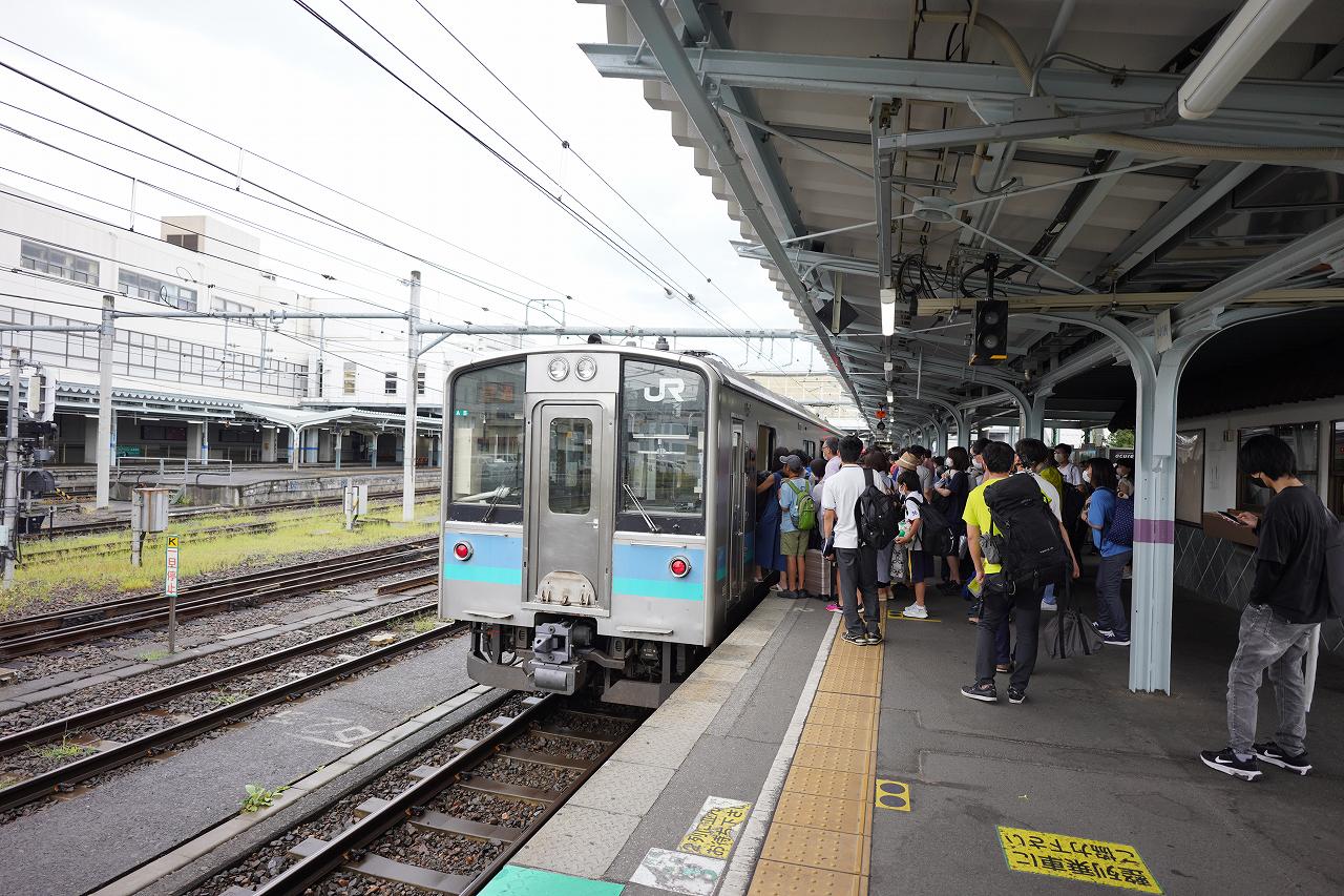 列車は701系のような見た目なE127系100番代。701系のようにオールロングシートではなく、一部ボックスシートとなっている列車ですが、見てわかるとおりに乗客も多くて立ち客も出る状況。2両じゃ若干足りない感じも否めない感じもしますね。