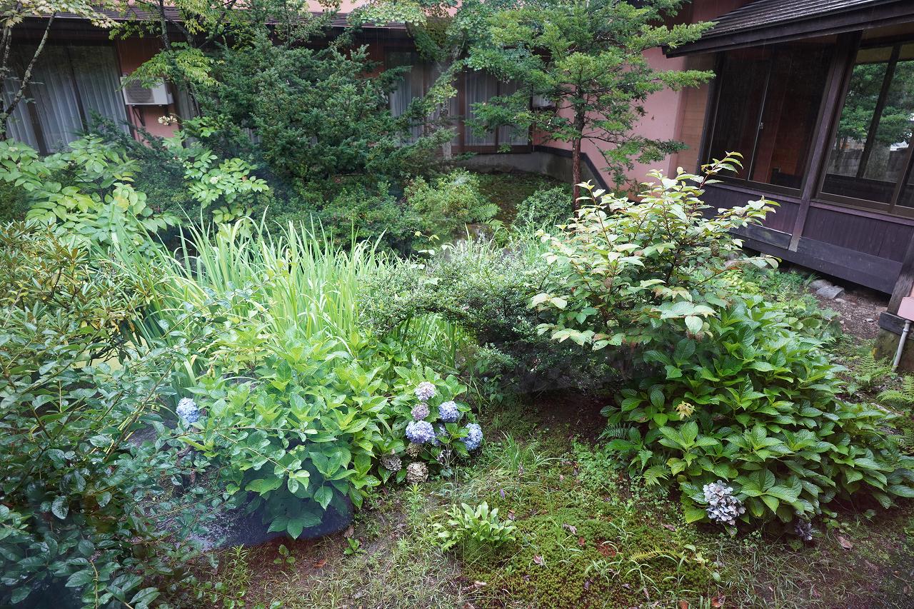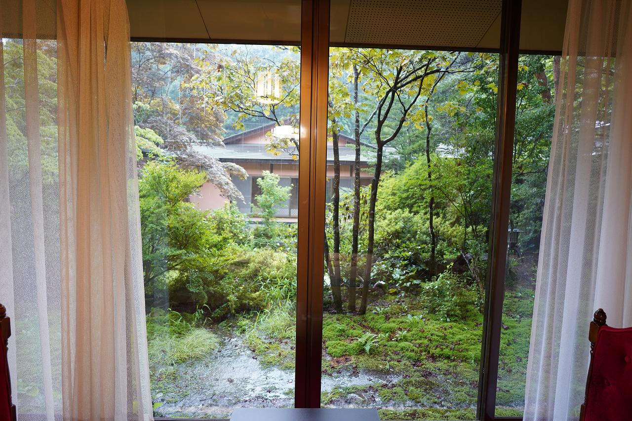 用意されていたお茶請けと広縁からの中庭の眺め。天気が良ければ窓を開けて良い空気を吸いつつと思ったのですが、土砂降りなのでどうしようもない。明日は止むようなので明日に期待しましょうか。