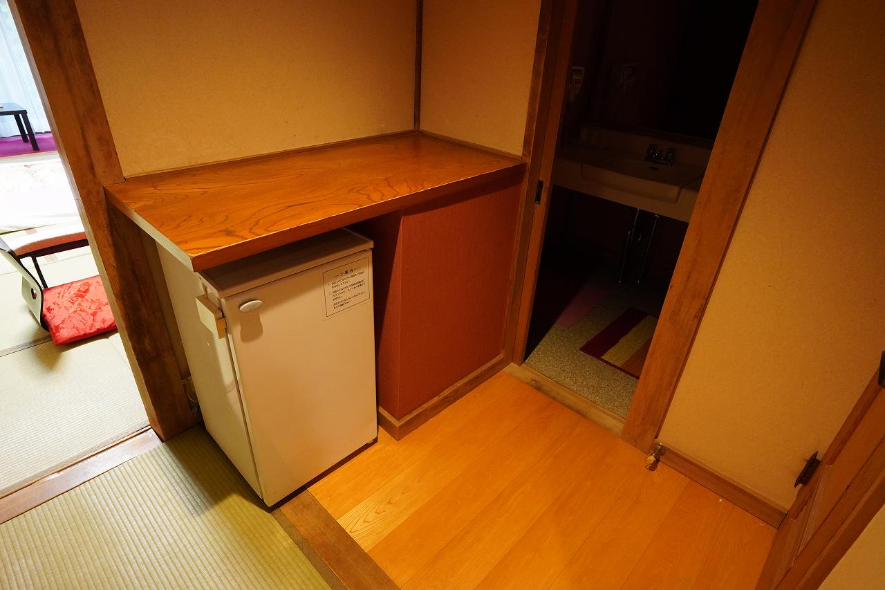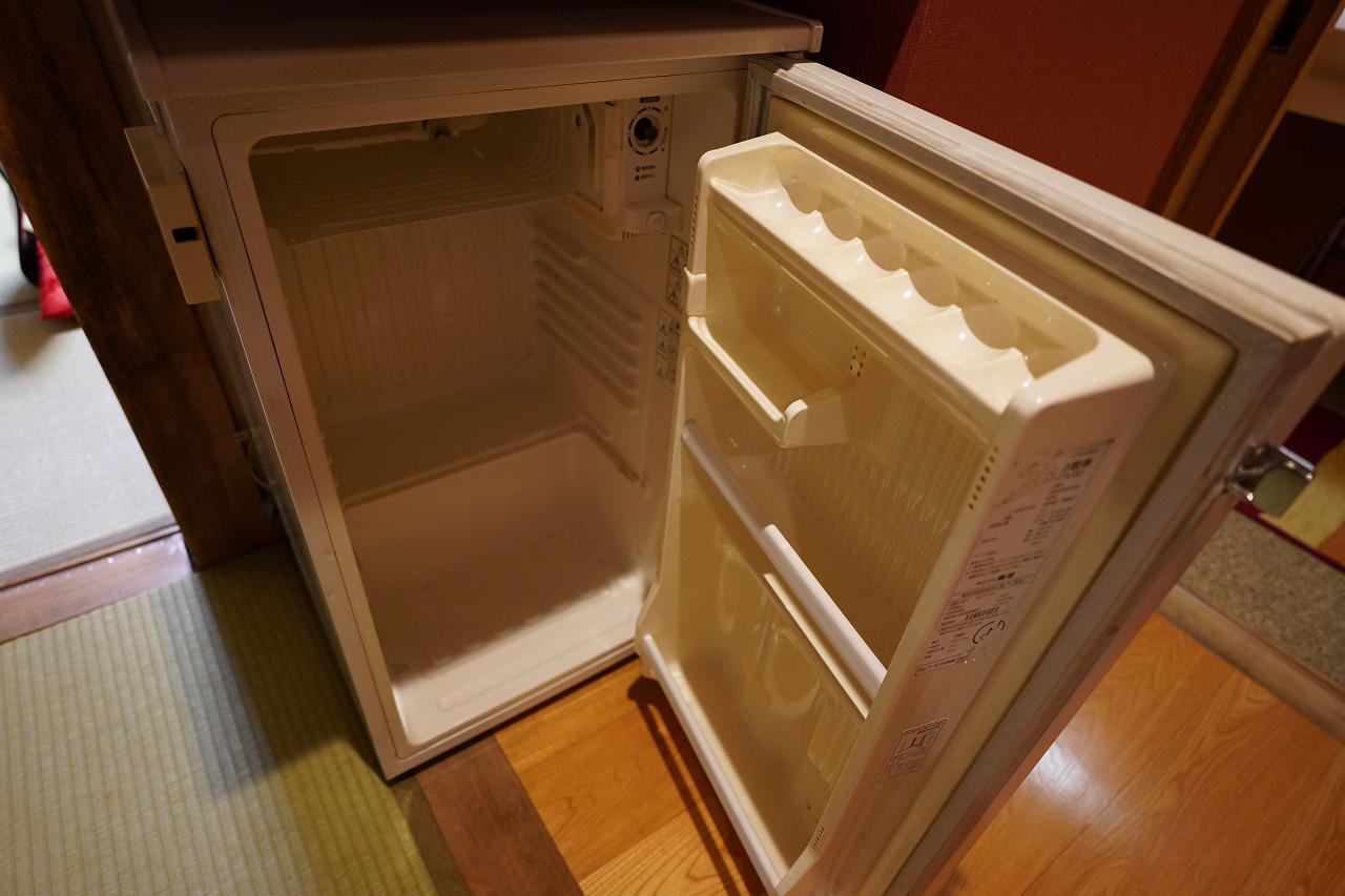 冷蔵庫には昔ながらの仕組み?と思って開けたら中身は空っぽ。自由に使えるのはありがたいですね。周りにコンビニとかもなさそうだし……。