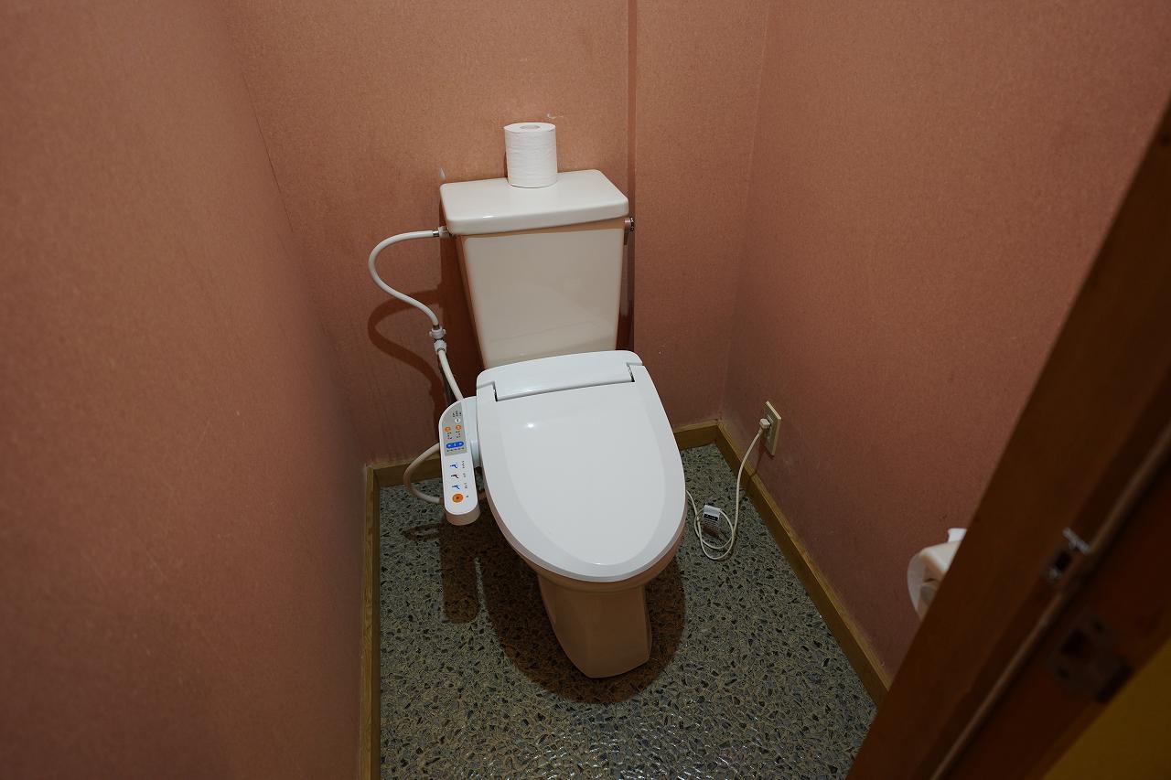 洗面所とトイレ。お風呂は大浴場を使うので使うことはないのですが、一般の家のような給湯器が付いてて驚き。そして洗面所はビジネスホテルのように狭くないのは良いですね。