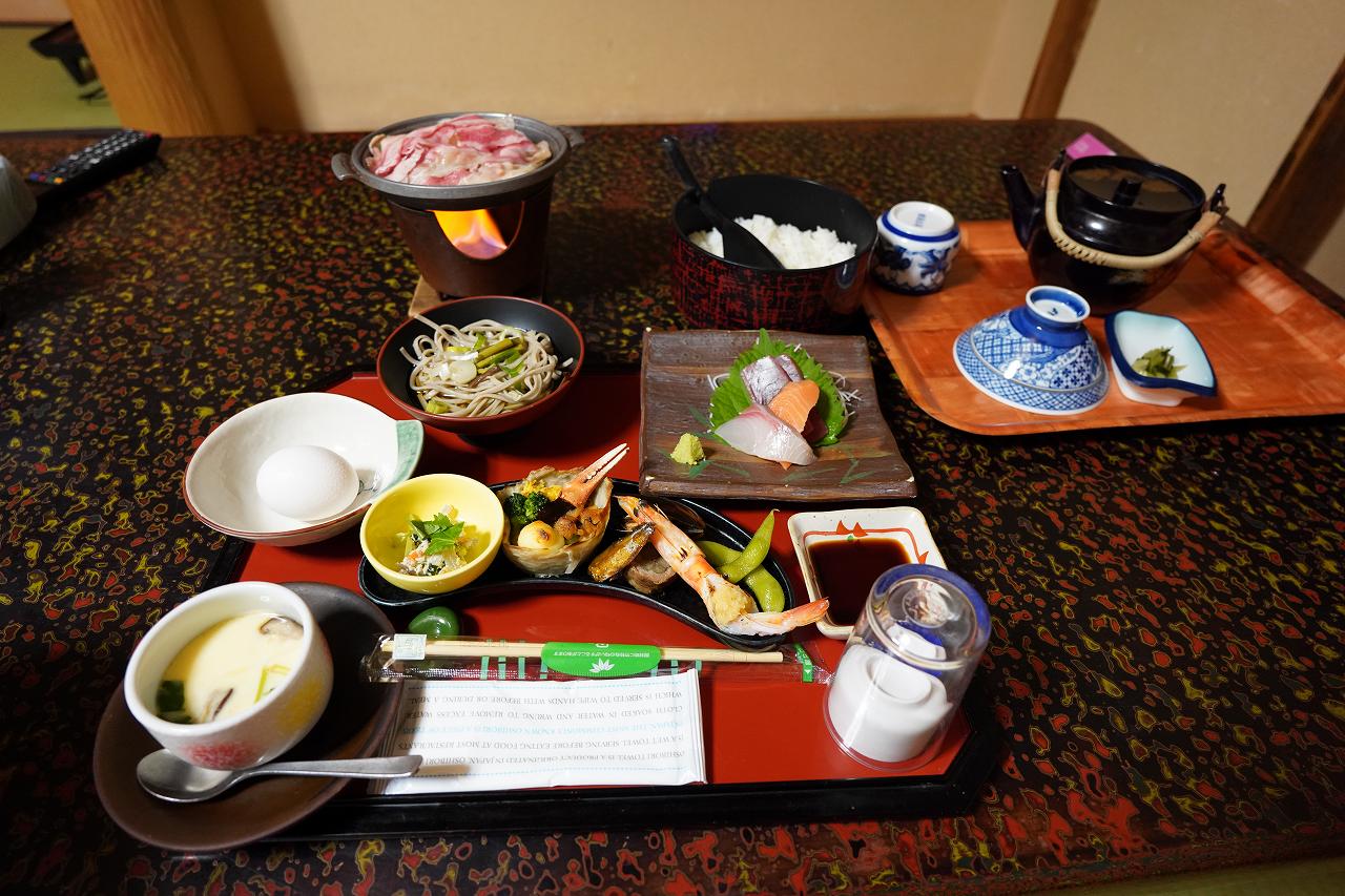 あんまり調べてなかったのですが、食事は部屋食のようです。部屋食だと周りの目とか気にしないで食べられるので嬉しいですね。食事内容は和会席料理。信州らしい蕎麦の他、すき焼きや刺身、茶碗蒸しなどのメニューが並びます。