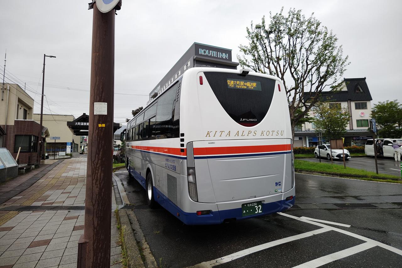 信濃大町駅に到着する時間は15時05分、大町温泉郷に行くバスは10分発。乗り過ごすと1時間後だったので急いでバス停へ。無事に間に合って一安心です。