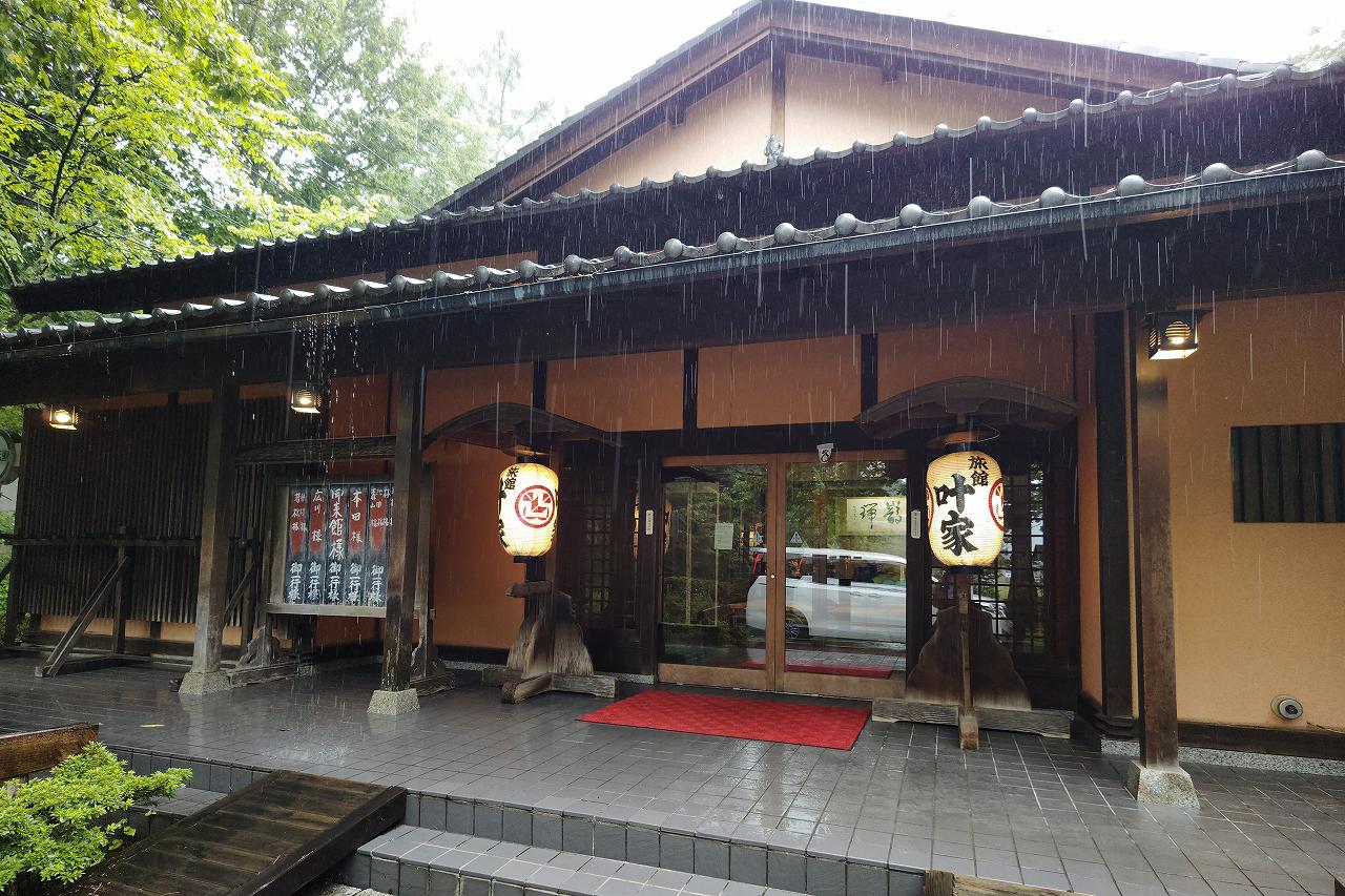 バスに乗ってバス停に到着したら雨。仕方ないので傘をさして宿へと向かいます。今回の宿は、以前高級料亭だったという旅館「叶家」という宿です。場所と雰囲気が良さそうだなとチョイスしました。