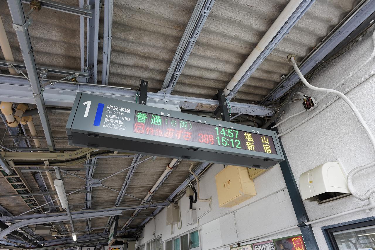 買い物を終えて駅に戻ってきました。ここからは甲府に行ってから、また乗り換えて……。という感じ。あんまり高尾まで一気に行ける列車ってないんですよね。東海道本線のように乗り換えていきます。