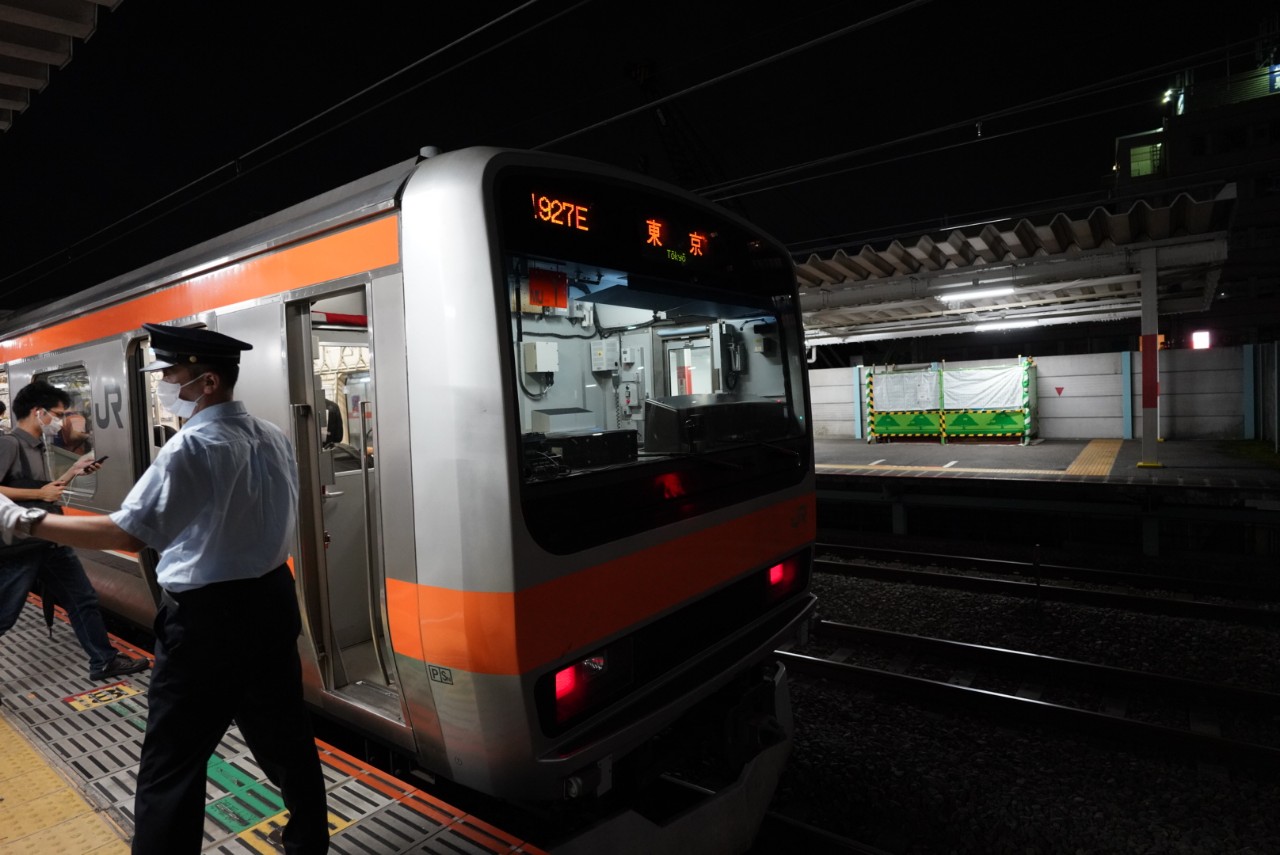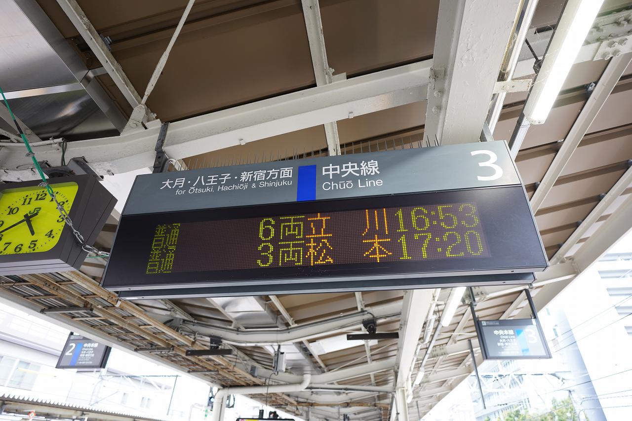 乗車するのは青梅線からの快速東京行き。次の快速は八王子からと、どんどん列車がやってきます。高尾・八王子・立川と一気に本数が増えていきますね。