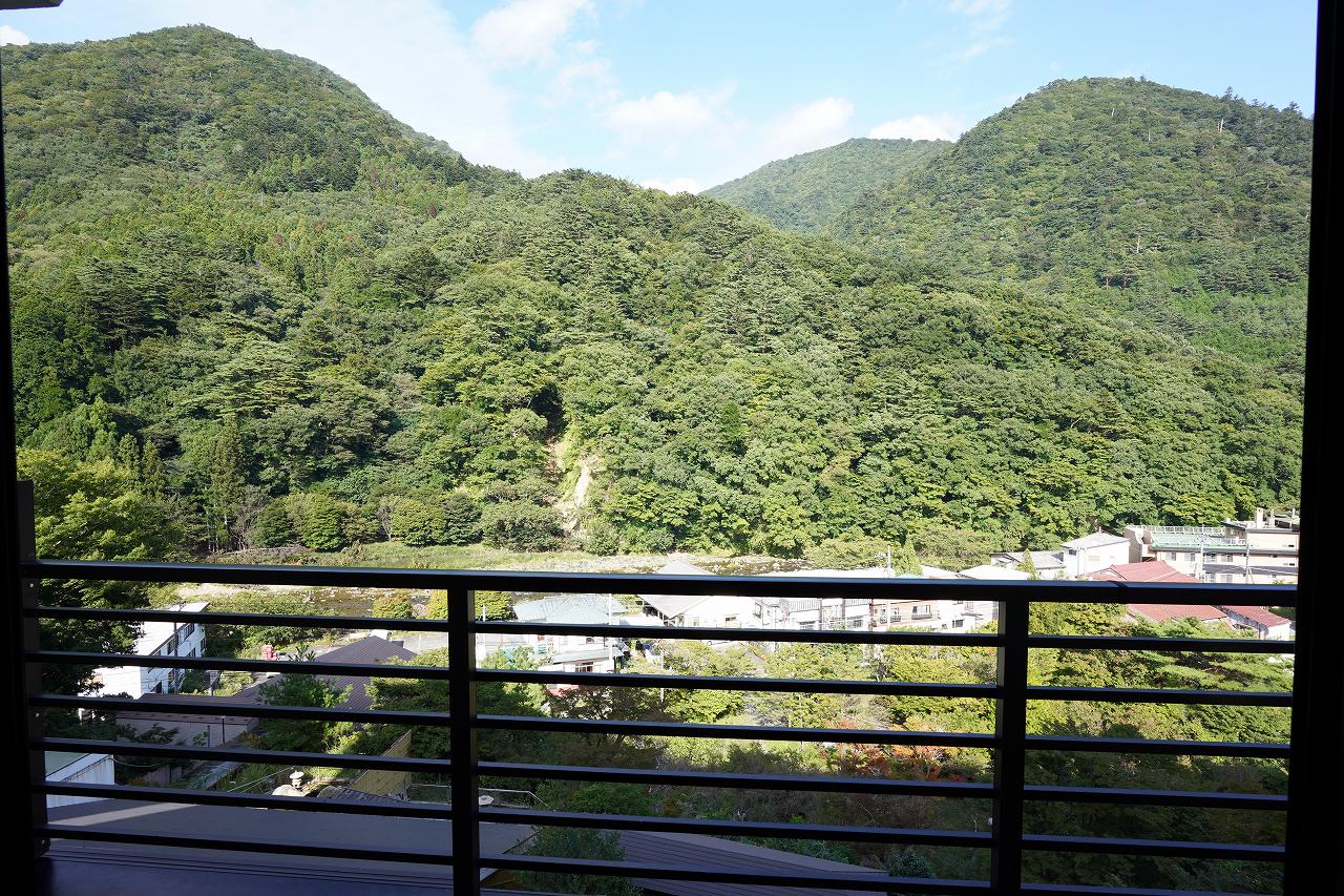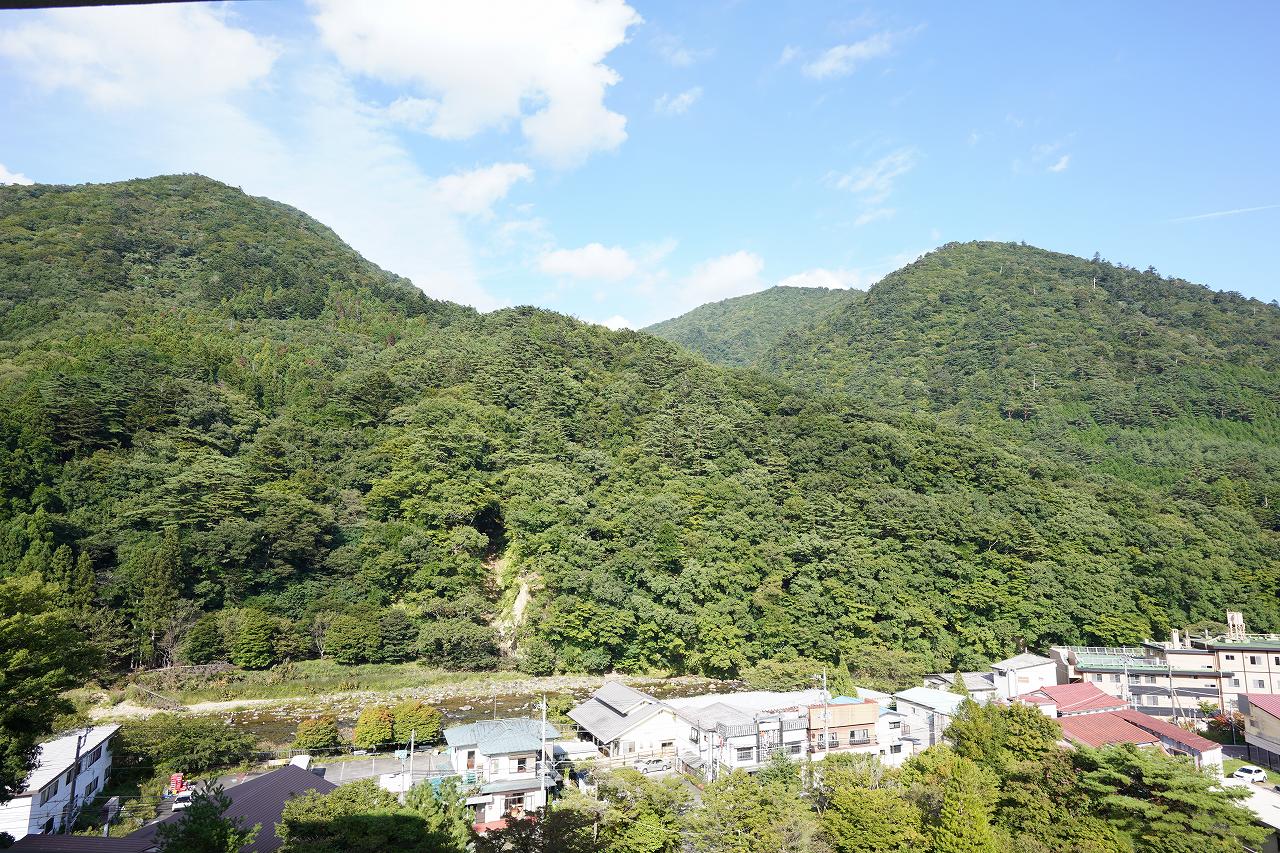 部屋は山が良く見える場所。夜とかは窓を開けていたいんですが、網戸がないので虫が入ってくるんですよね。今の時期は夜こそ窓を開けておきたい気温なんですが……。