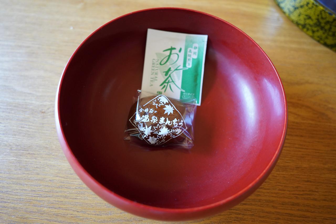 お茶請けには温泉まんじゅうが用意されています。鬼怒川温泉はきぬの清流ですが、塩原は違うんですよね。
