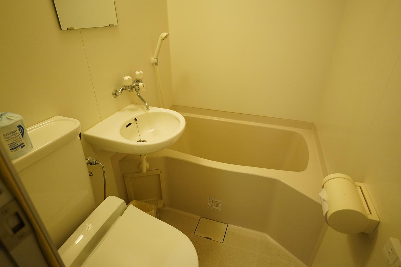 入り口近くには洗面台とトイレ・バスがあります。トイレはウォシュレットとなっていました。