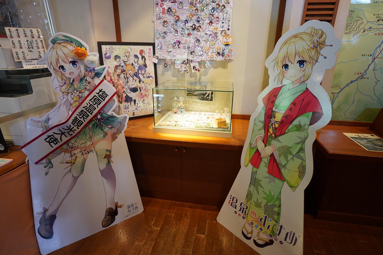 まだ15時位なのですが、今日はやることが決まっています。まずは塩原温泉の中心部にある「塩原もの語り館」へ。ここはお土産や足湯、レストランなどがある道の駅のような施設です。中には塩原温泉の温泉むすめ「塩原八弥ちゃん」の看板も展示されています。