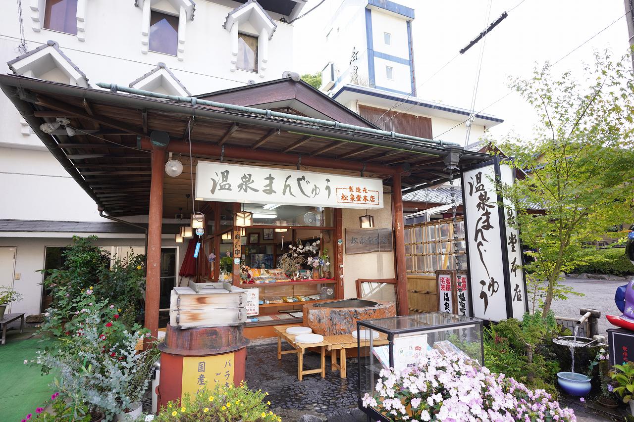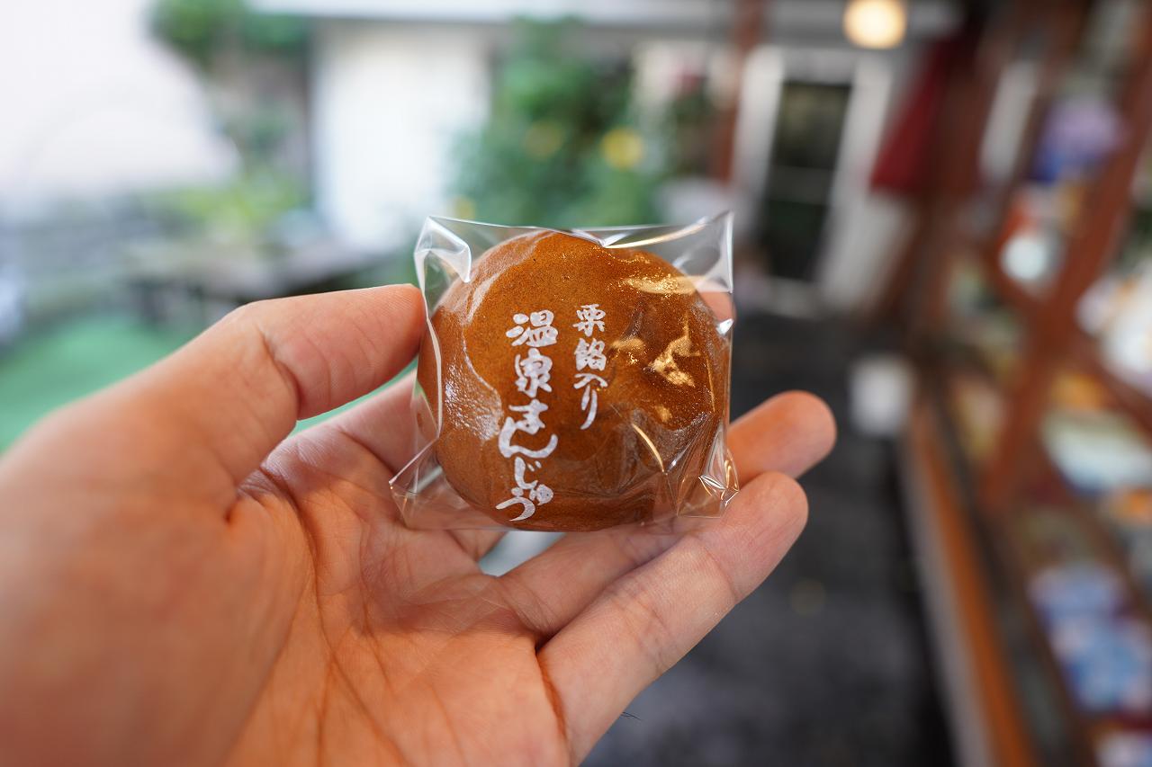 近くに温泉まんじゅうのお店があったので寄ってみることに。栗あん入りと珍しい温泉まんじゅうです。