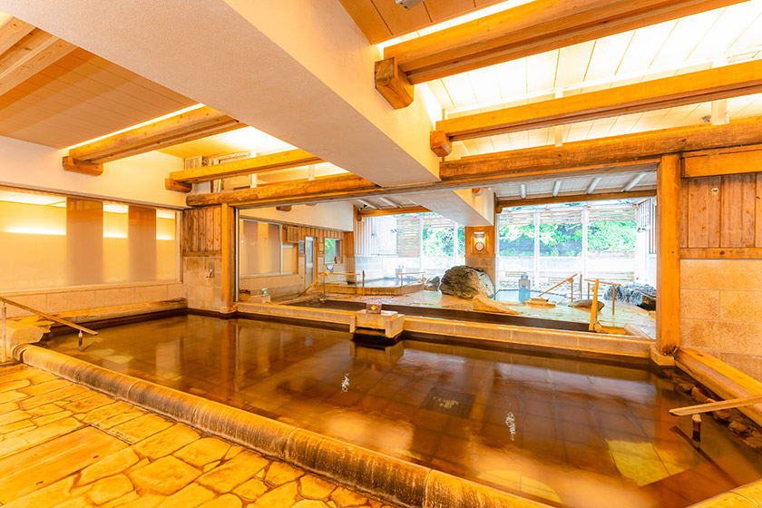 温泉の内部はこんな感じ。広々としていて、内湯と外湯が一緒になっている感じのスタイルです。手前は普通の温泉、奥は生薬入りの温泉となっています。