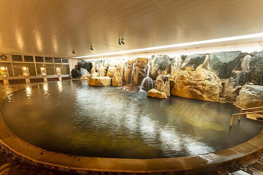 西館の大浴場はこんな感じの雰囲気。岩風呂から温泉がバシャバシャ流れ落ちています。しかし先ほどの温泉よりも換気が悪いので、入った瞬間に塩素臭がぶわっと。ちょっと気になります。