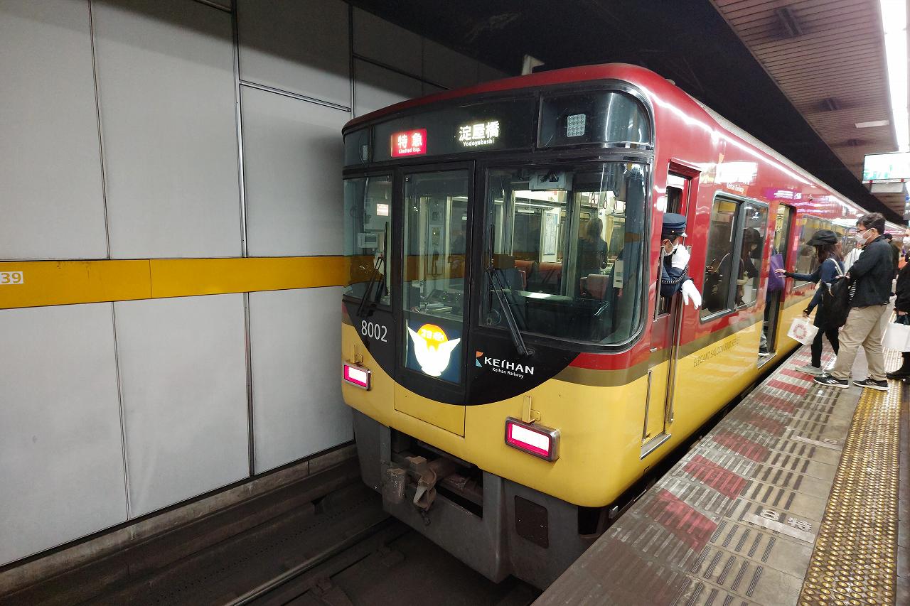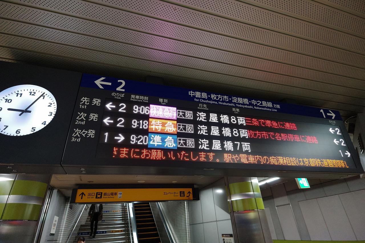 列車は特急淀屋橋行き。ちなみに一応特急が頻繁に走っている中では最速種別なようでした。それより上には京都から大阪までノンストップな「洛楽(らくらく)」という快速特急も運行されていますが、こちらはあんまり本数はありません。