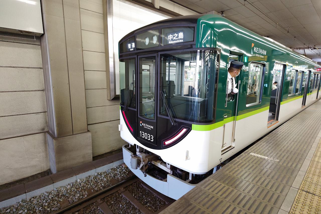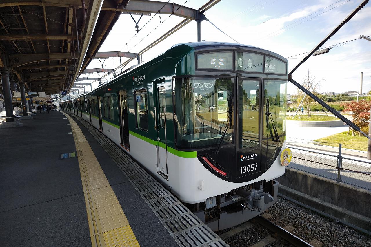 車両は京阪13000系、ここはクロスシートではなくロングシートでの運用となっています。