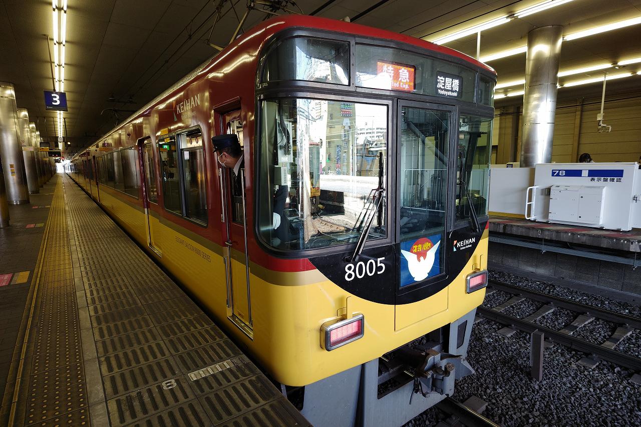 列車は8000形でしたが、中書島で撮り忘れたので降りた京橋で撮影してきました。ヘッドマークがあるのが面白いですね。