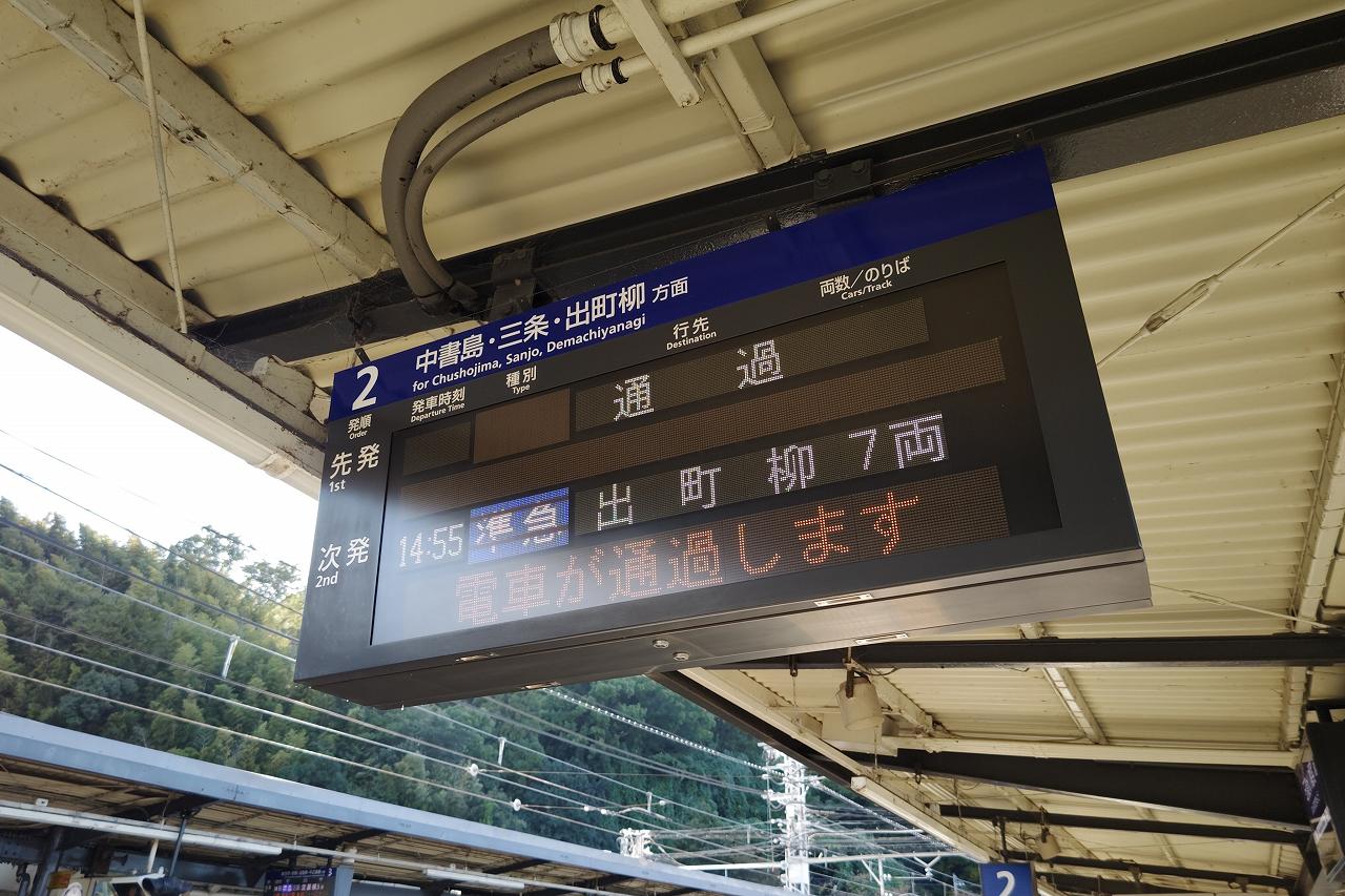 行き先は出町柳行き。正直「出町柳」とか「淀屋橋」と言われてもどこだよという人が居ると思うので、四角で京都や大阪と記述がされています。