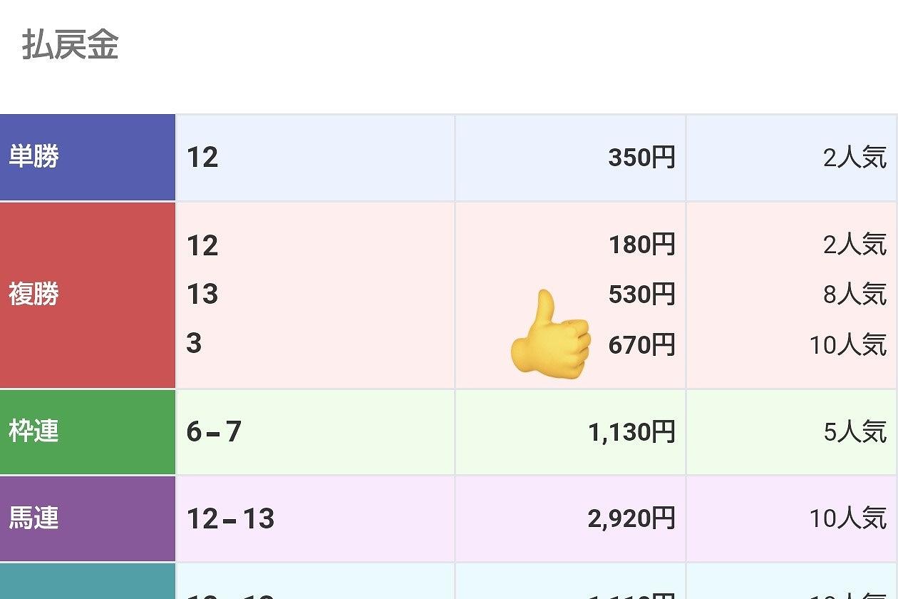 まったく予想も無く「3-1-2」かなぁと思い、買い方もわからないので複勝が良かったっけ?あれ1個しか選べないんか、じゃあ3でいいやと超適当に購入したら当たっちゃいました……。まあ570円ですけどね。