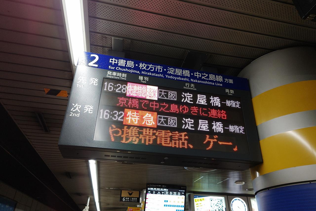 京橋と聞くと銀座線が出てくるのが関東民ですが、大阪では複数路線の乗り入れるターミナル駅となっています。約30分の乗車です。