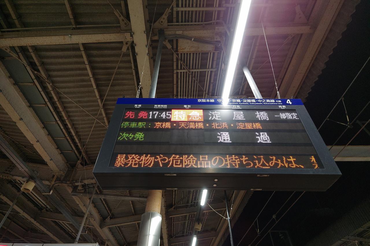 枚方市に帰還した頃にはもうかなりの暗さ。大阪方面の列車に乗り、淀屋橋……ではなく途中の京橋まで乗車します。