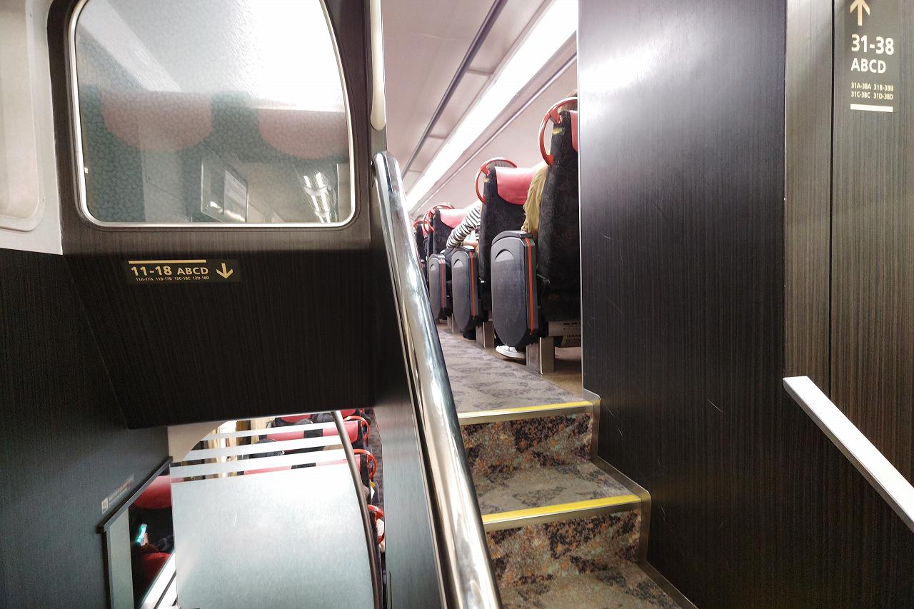 シートはひじ掛け付きのクロスシート。座り心地も良好で足を伸ばすこともできます。さらに一部の車両は「ダブルデッカー」という2階建ての車両で、床がカーペット敷きという高級感。でも乗車券だけで乗れ、有料の「プレミアムカー」はさらなる豪華な設備なようです。