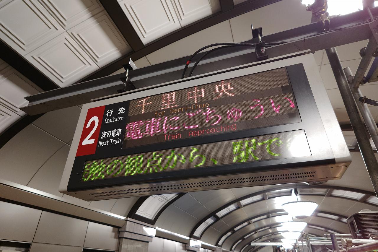 列車は千里中央行き。途中の中津駅より先は地上を走り、江坂より先は北大阪急行に直通します。Osaka Metroの乗り放題きっぷを使用する際には、江坂以北は別途運賃が必要なのは注意しましょう。
