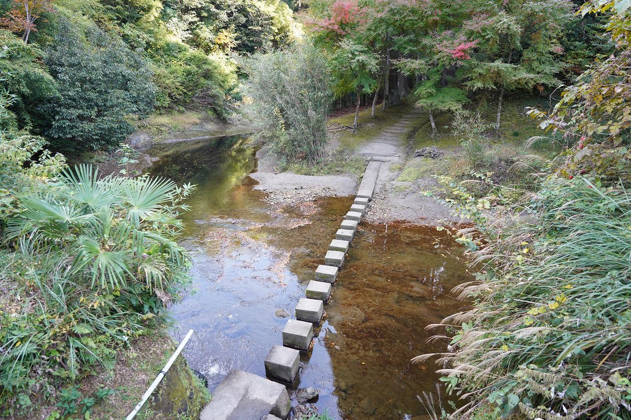 この裏手には川があり、飛び石で渡ることができるようになっています。渡った先には神社があるようですが、時間がないので今回はパスすることに。