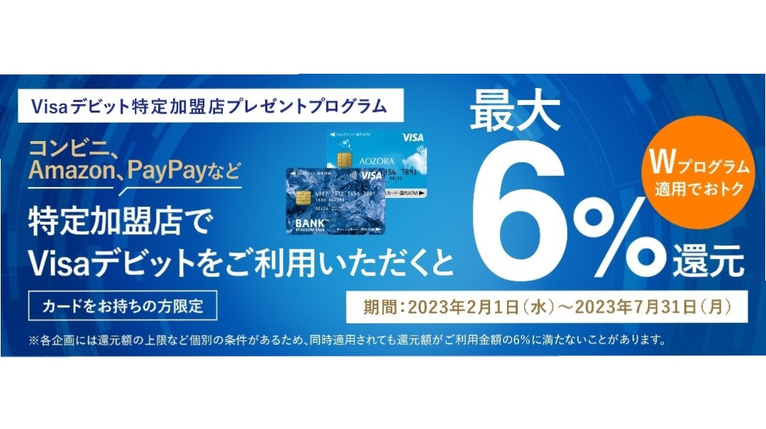 あおぞら銀行では同社が提供するVisa機能付きデビットカード「あおぞらキャッシュカード・プラス」を所持している人向けに、特定の加盟店で通常の1%に加えて5%を上乗せするキャンペーンを行っています。