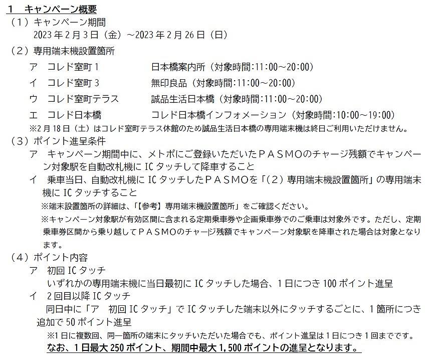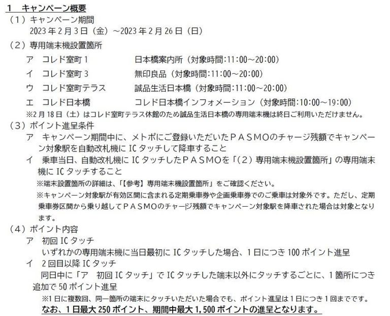 キャンペーンとしては、東京メトロにメトポ登録したPASMOを用いて三越前か日本橋駅まで乗車し、コレド室町か日本橋に設置される専用端末にタッチすることでポイントがもらえるという内容です。