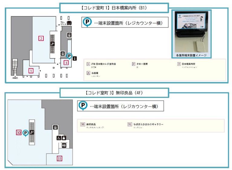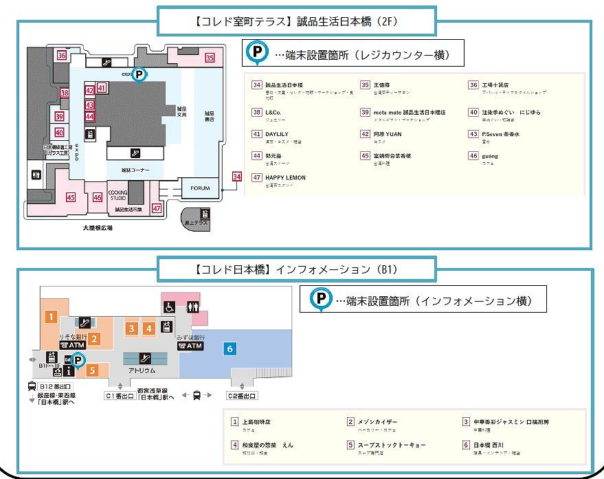 専用端末はコレド室町1、コレド室町3、コレド室町テラス、コレド日本橋に設置されます。