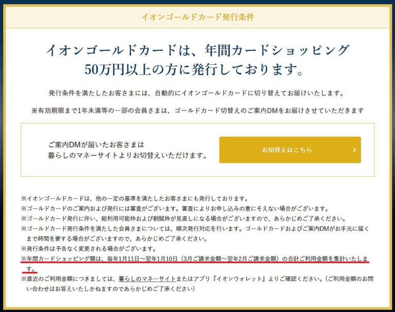 イオンゴールドカードのサイトに記載があるのですが、年間カードショッピング額は「毎年1月11日~翌年1月10日(3月ご請求金額~翌年2月ご請求金額)の合計ご利用金額を集計」と記載があります。これって以前は無かった表記なんです。